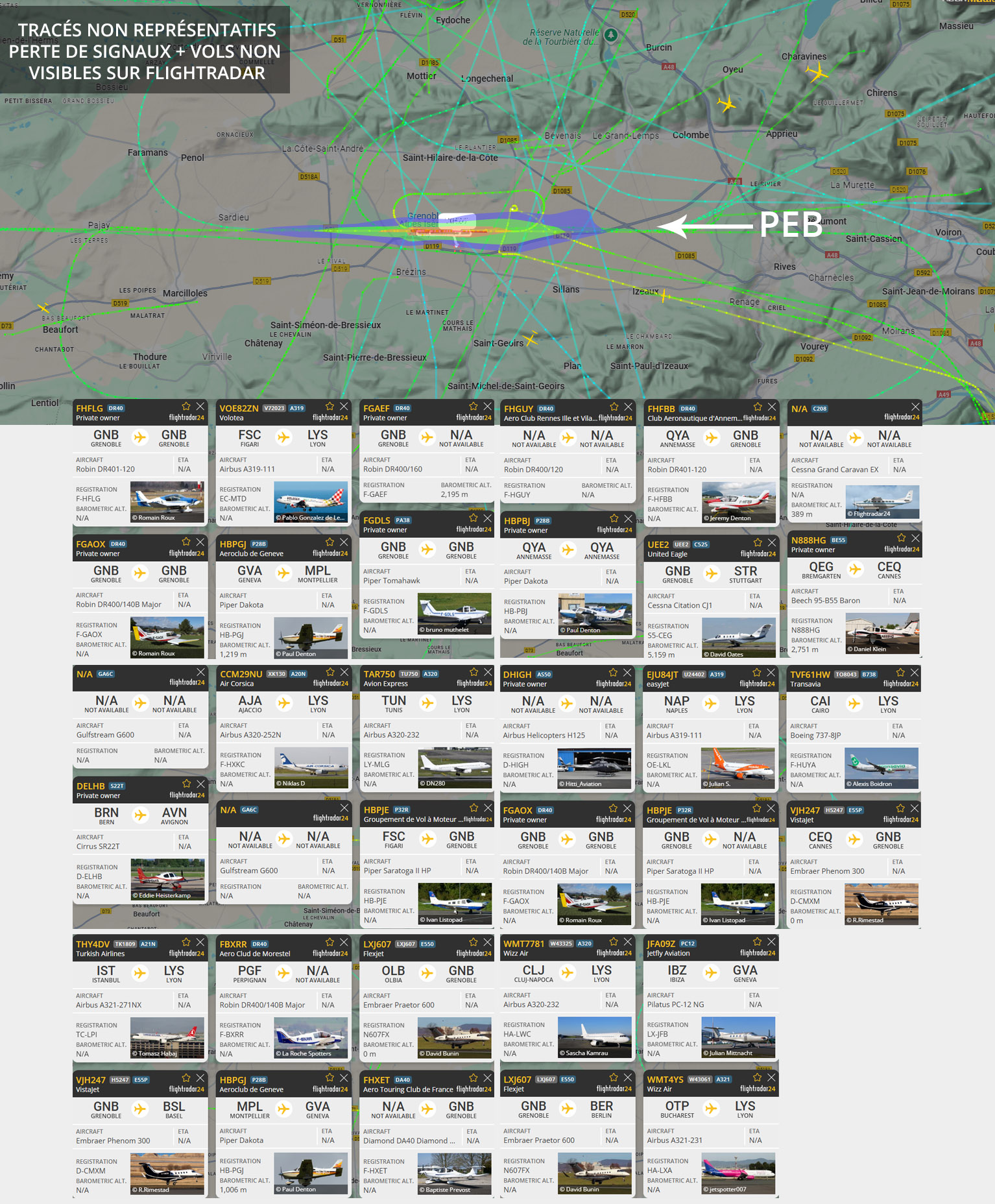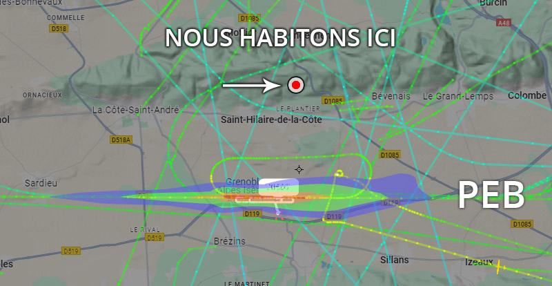 Visuel non représentatif de la réalité, perte fréquente de signaux et vols non visibles sur Flightradar. * PEB : Plan d’exposition au bruit, absolument non représentatif de la réalité.