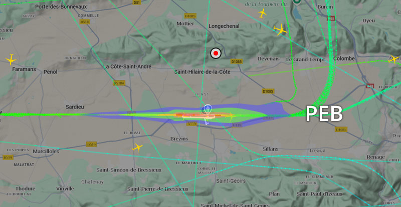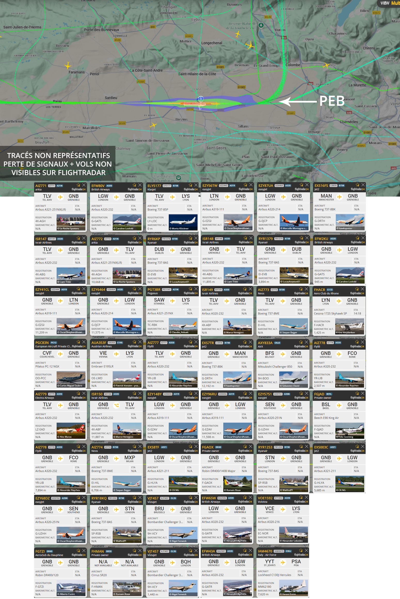 Visuel non représentatif de la réalité, perte fréquente de signaux et vols non visibles sur Flightradar. * PEB : Plan d’exposition au bruit, absolument non représentatif de la réalité.
