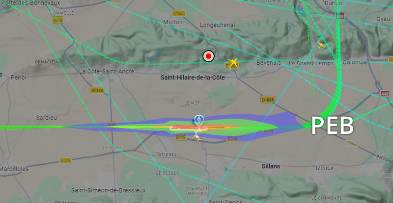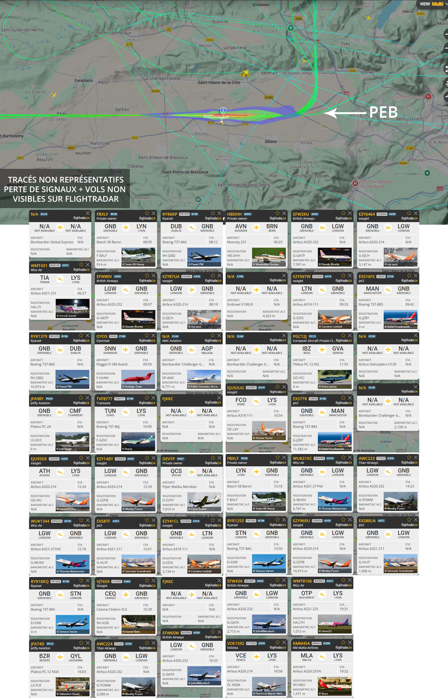 Visuel non représentatif de la réalité, perte fréquente de signaux et vols non visibles sur Flightradar. * PEB : Plan d’exposition au bruit, absolument non représentatif de la réalité.