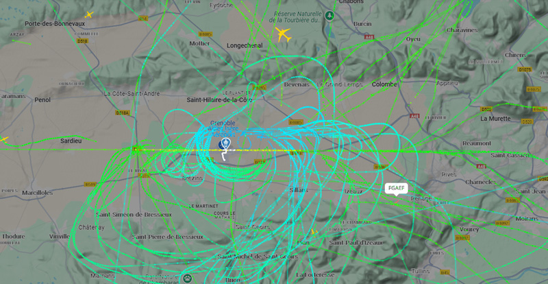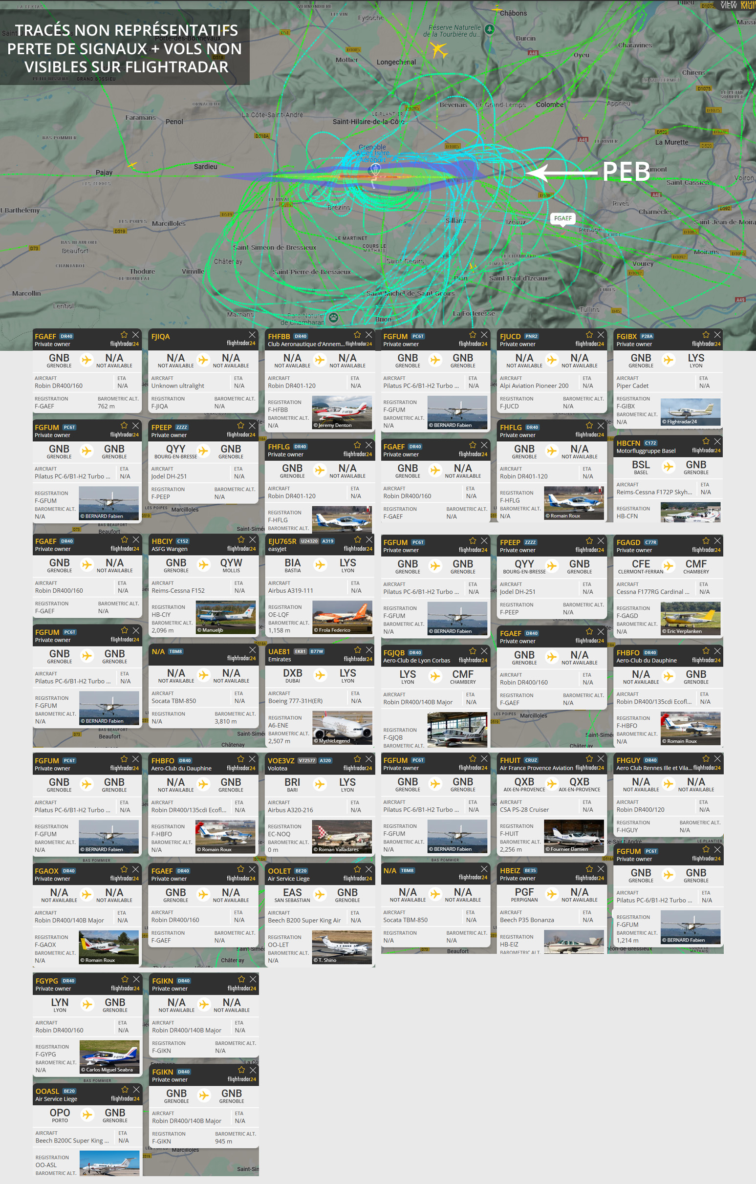 Visuel non représentatif de la réalité, perte fréquente de signaux et vols non visibles sur Flightradar. * PEB : Plan d’exposition au bruit, absolument non représentatif de la réalité.