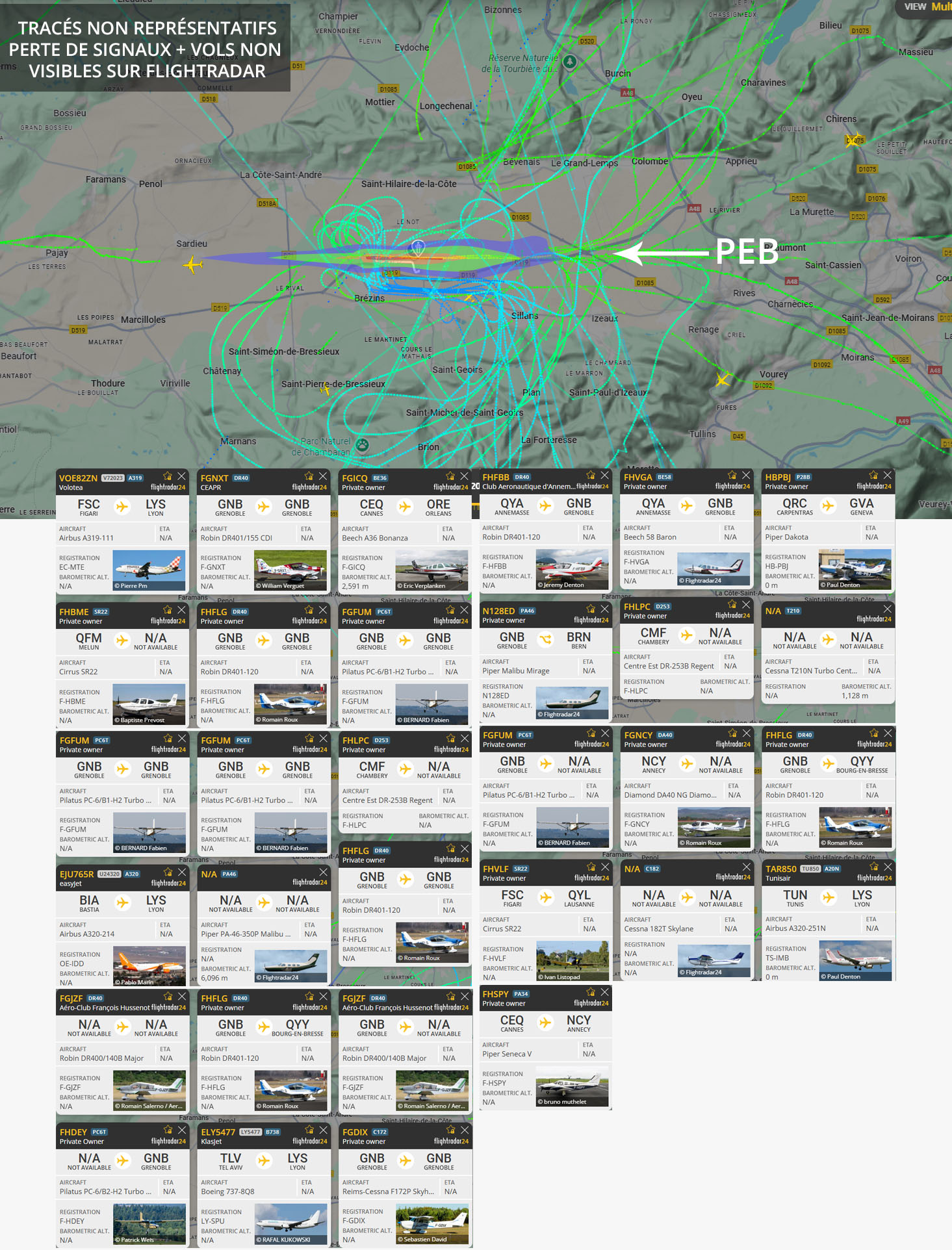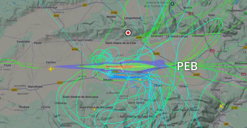 Visuel non représentatif de la réalité, perte fréquente de signaux et vols non visibles sur Flightradar. * PEB : Plan d’exposition au bruit, absolument non représentatif de la réalité.