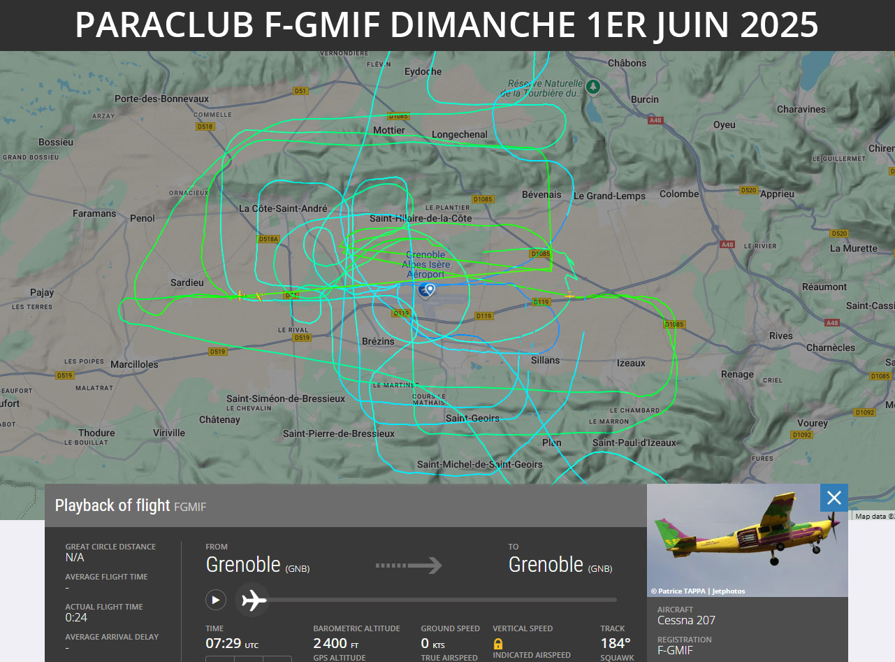 Des nuisances le matin, le midi, l’après-midi jusqu’à l’arrivée de la pluie. Les nuisances ont débuté à 8h30 ce dimanche avec le F-GMPM d’EVASAIR, puis les paras ont pris le relais à partir de 9h30, un dimanche… À partir de 11h30, nous avons subit les tours de piste du F-PBEC appartenant à ROZENCWEIG GEORGES jusqu’à 12h30. En même temps, on subit les nuisances des paras, de nombreux passages sur les hauteurs (même quand vous passez au dessus du Mottier ou de Longechenal on vous entend très bien sur les hauteurs de Saint-Hilaire-de-la-Côte, vous le verrez sur la vidéo) jusqu’en milieu d’après-midi où la météo a fait cesser les nuisances… Et dernière nuisance à 0h00 où un avion en approche sur Lyon a fait un détour au dessus de l’aéroport de Saint Geoirs, la météo certainement…
