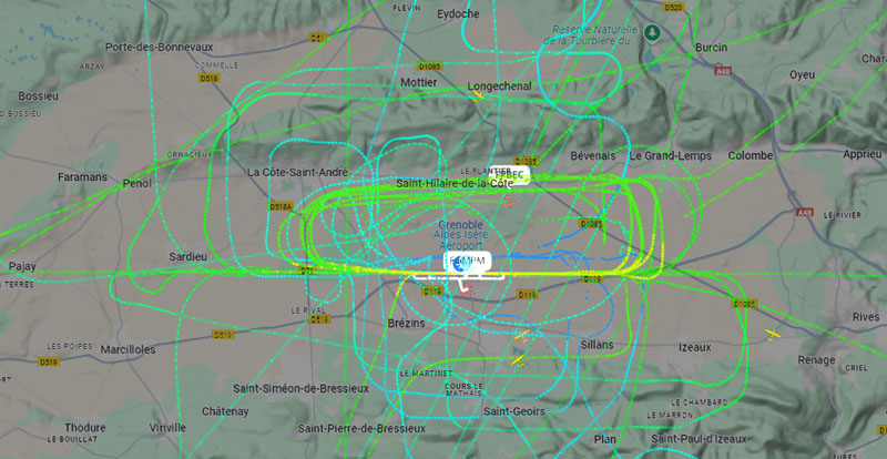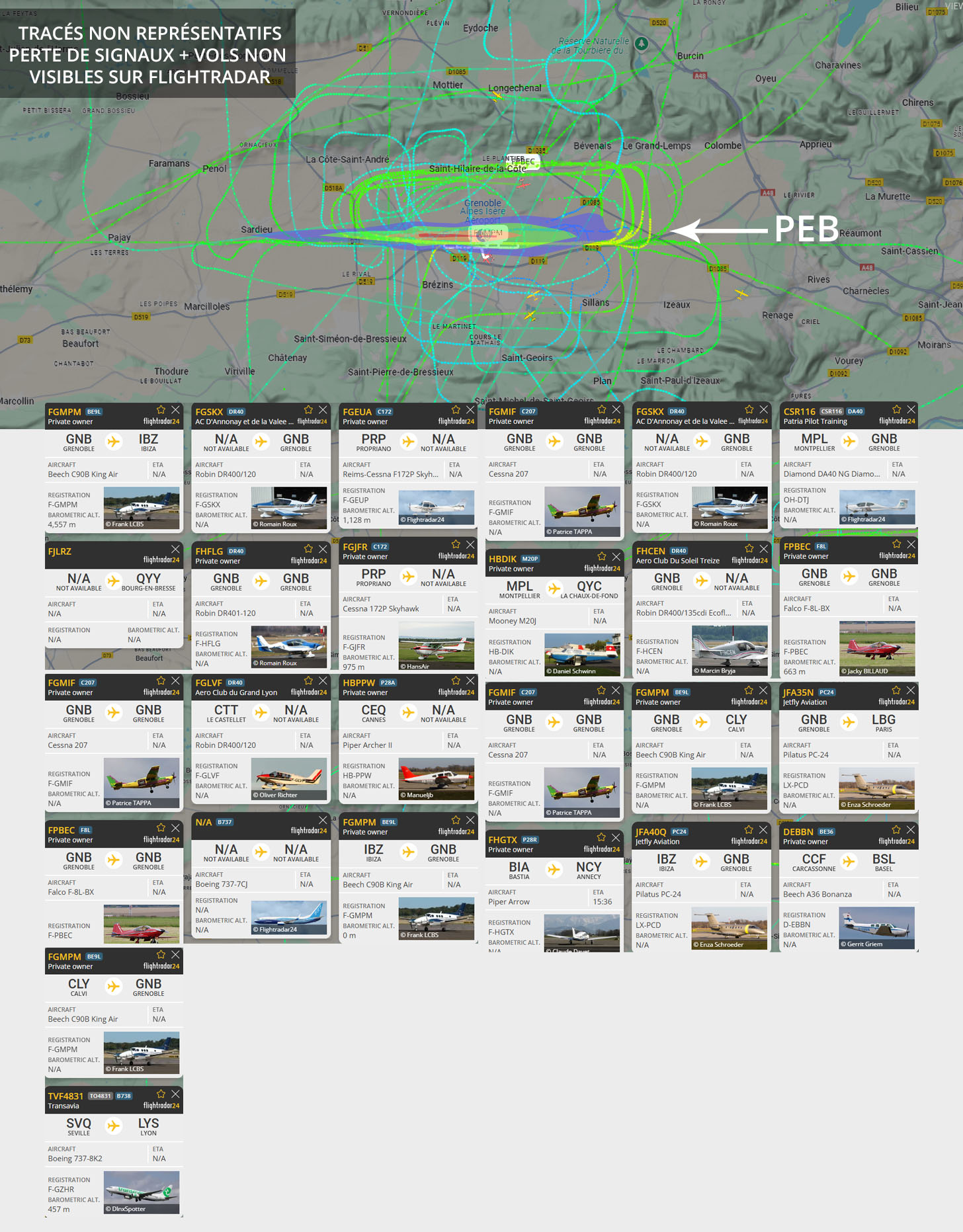 Visuel non représentatif de la réalité, perte fréquente de signaux et vols non visibles sur Flightradar. * PEB : Plan d’exposition au bruit, absolument non représentatif de la réalité.