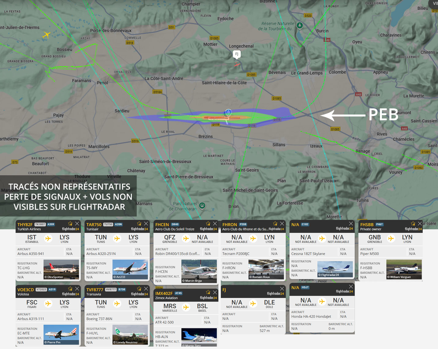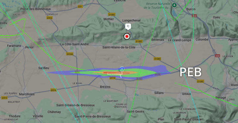 Visuel non représentatif de la réalité, perte fréquente de signaux et vols non visibles sur Flightradar. * PEB : Plan d’exposition au bruit, absolument non représentatif de la réalité.