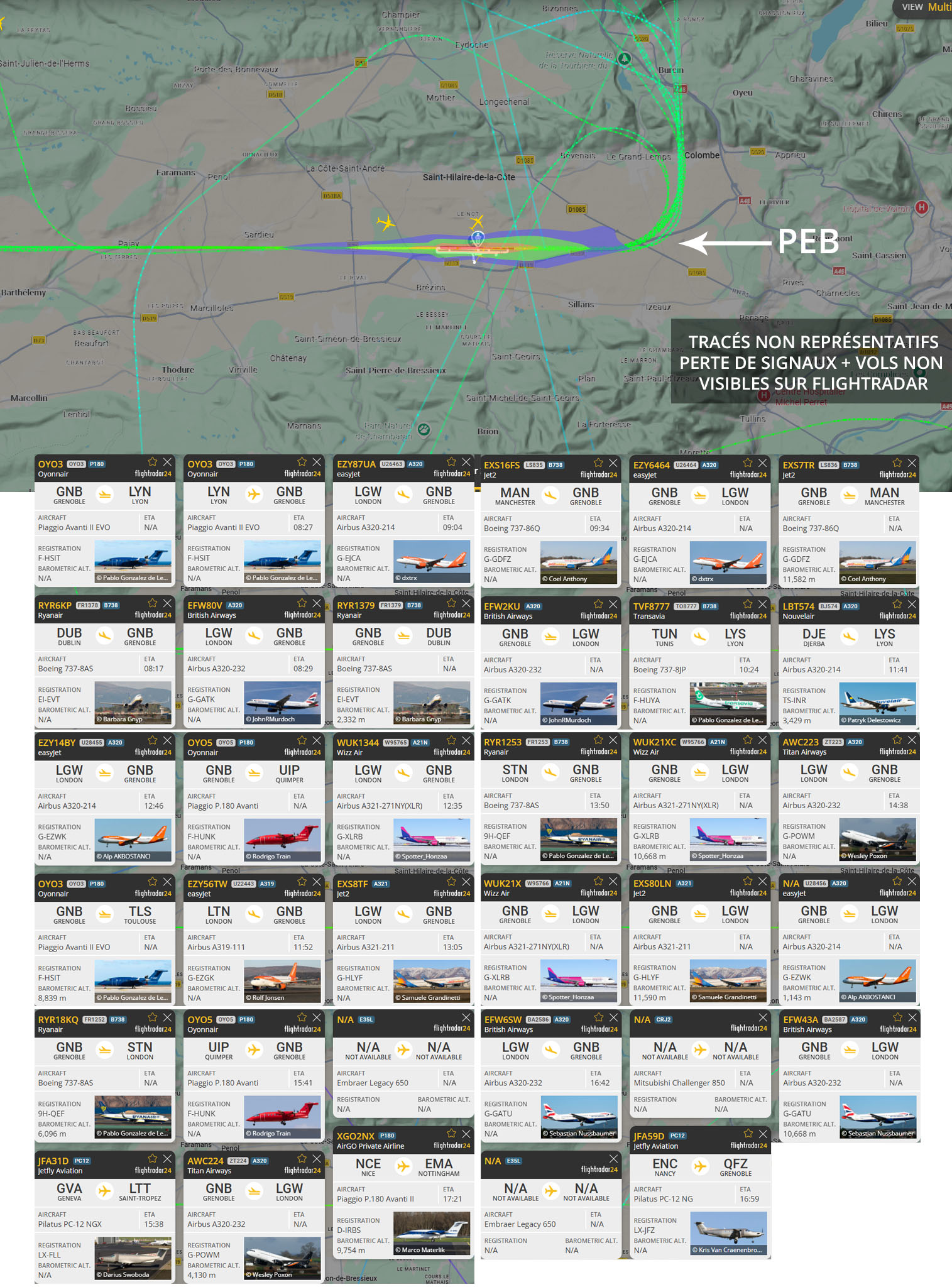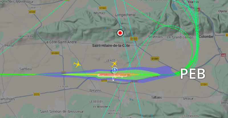 Visuel non représentatif de la réalité, perte fréquente de signaux et vols non visibles sur Flightradar. * PEB : Plan d’exposition au bruit, absolument non représentatif de la réalité.