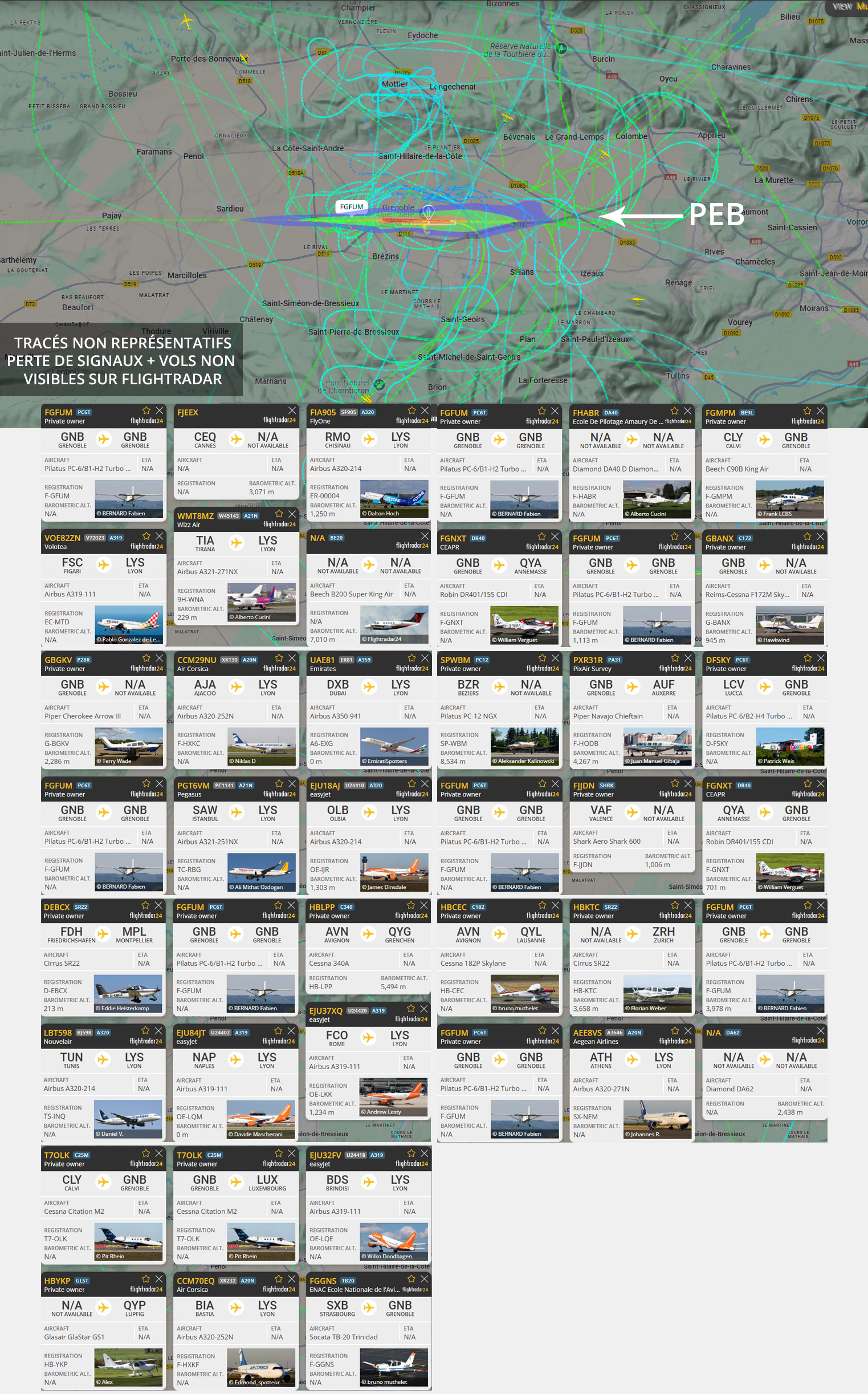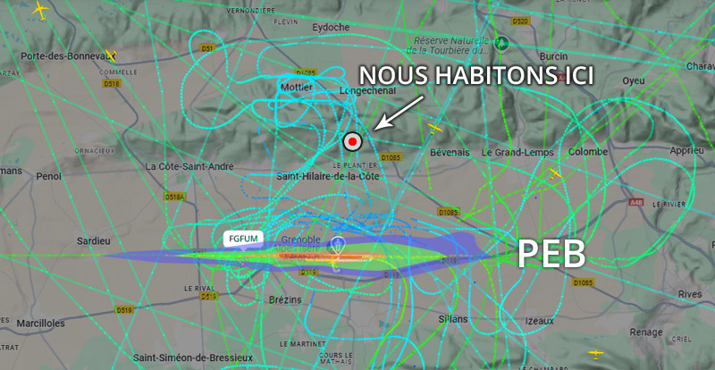 Visuel non représentatif de la réalité, perte fréquente de signaux et vols non visibles sur Flightradar. * PEB : Plan d’exposition au bruit, absolument non représentatif de la réalité.