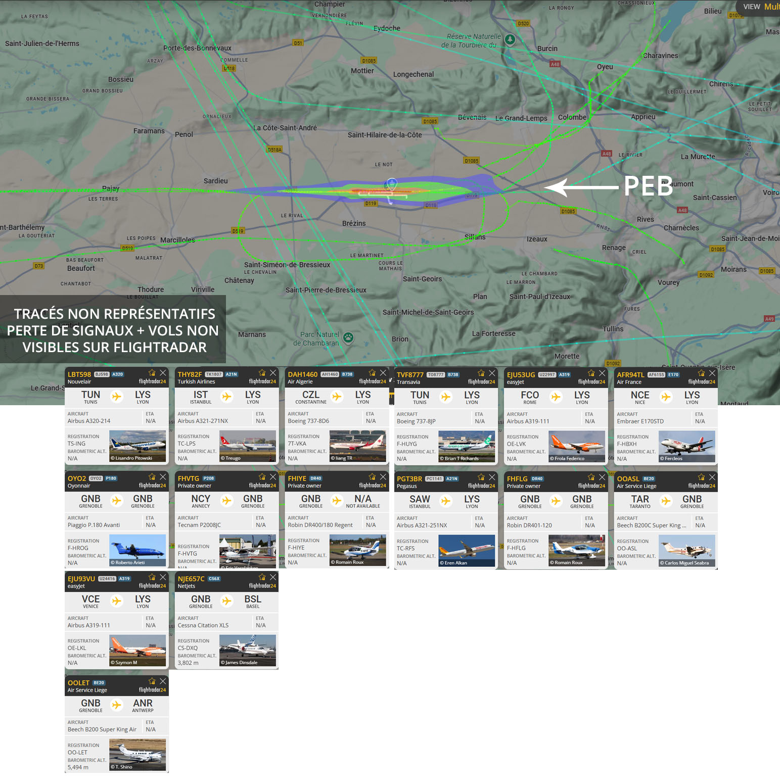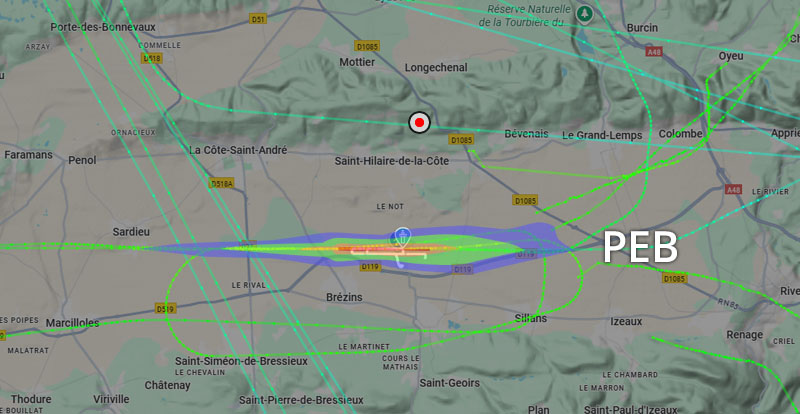 Visuel non représentatif de la réalité, perte fréquente de signaux et vols non visibles sur Flightradar. * PEB : Plan d’exposition au bruit, absolument non représentatif de la réalité.