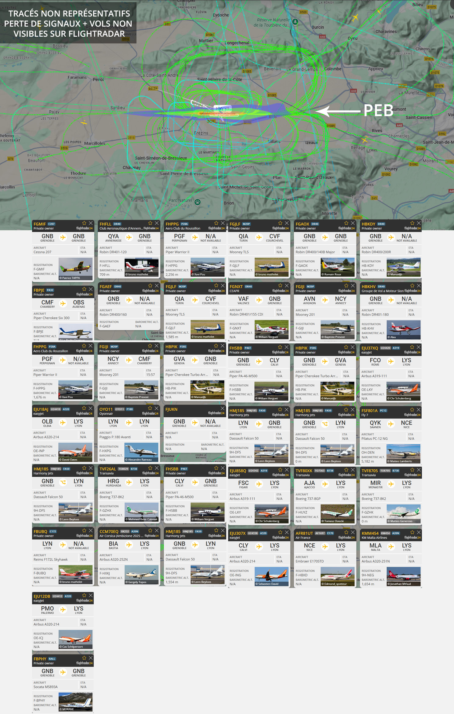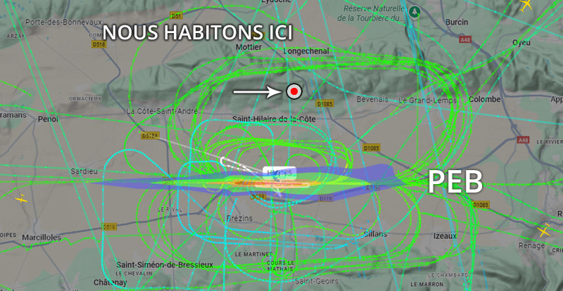 Visuel non représentatif de la réalité, perte fréquente de signaux et vols non visibles sur Flightradar. * PEB : Plan d’exposition au bruit, absolument non représentatif de la réalité.
