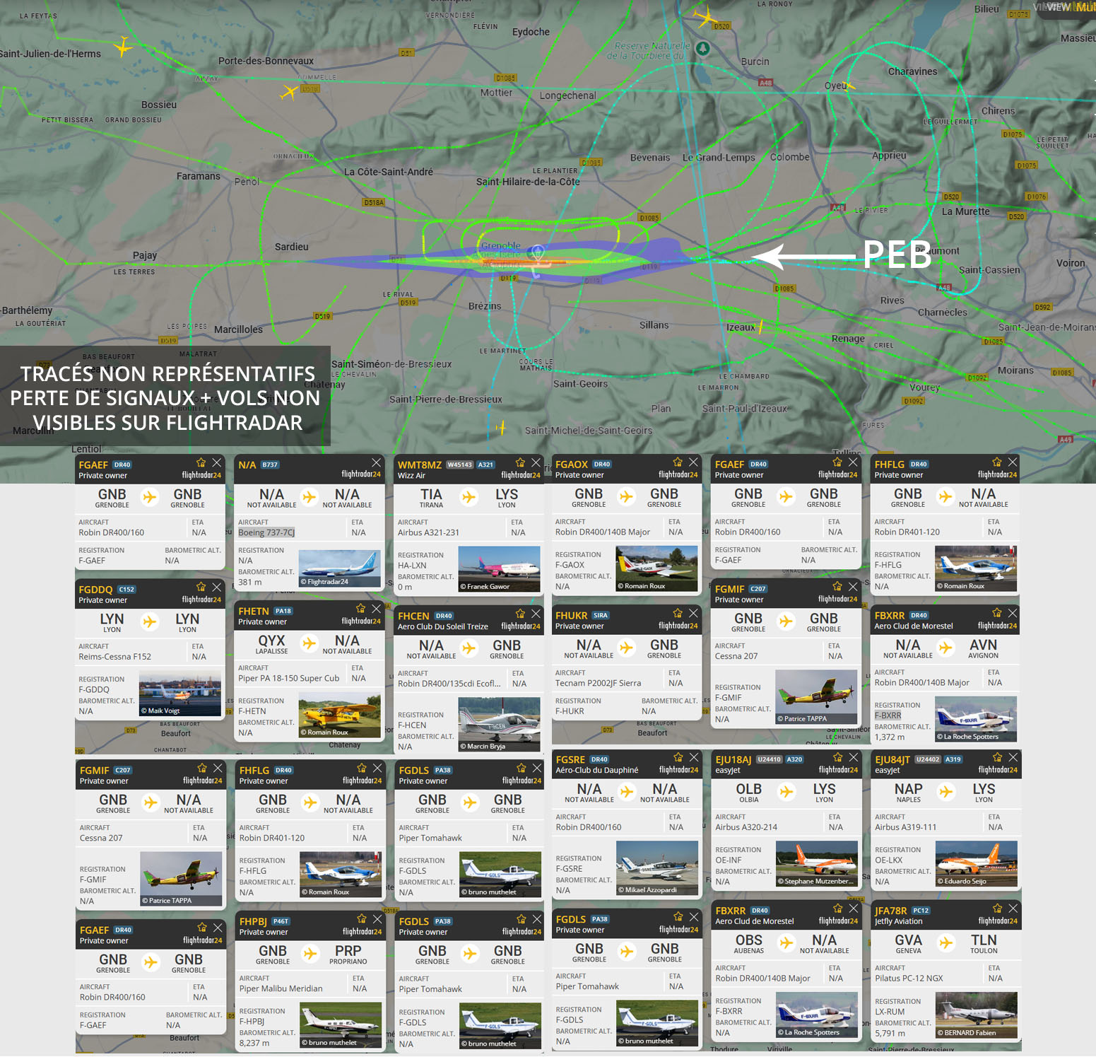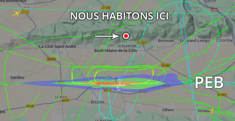 Visuel non représentatif de la réalité, perte fréquente de signaux et vols non visibles sur Flightradar. * PEB : Plan d’exposition au bruit, absolument non représentatif de la réalité.