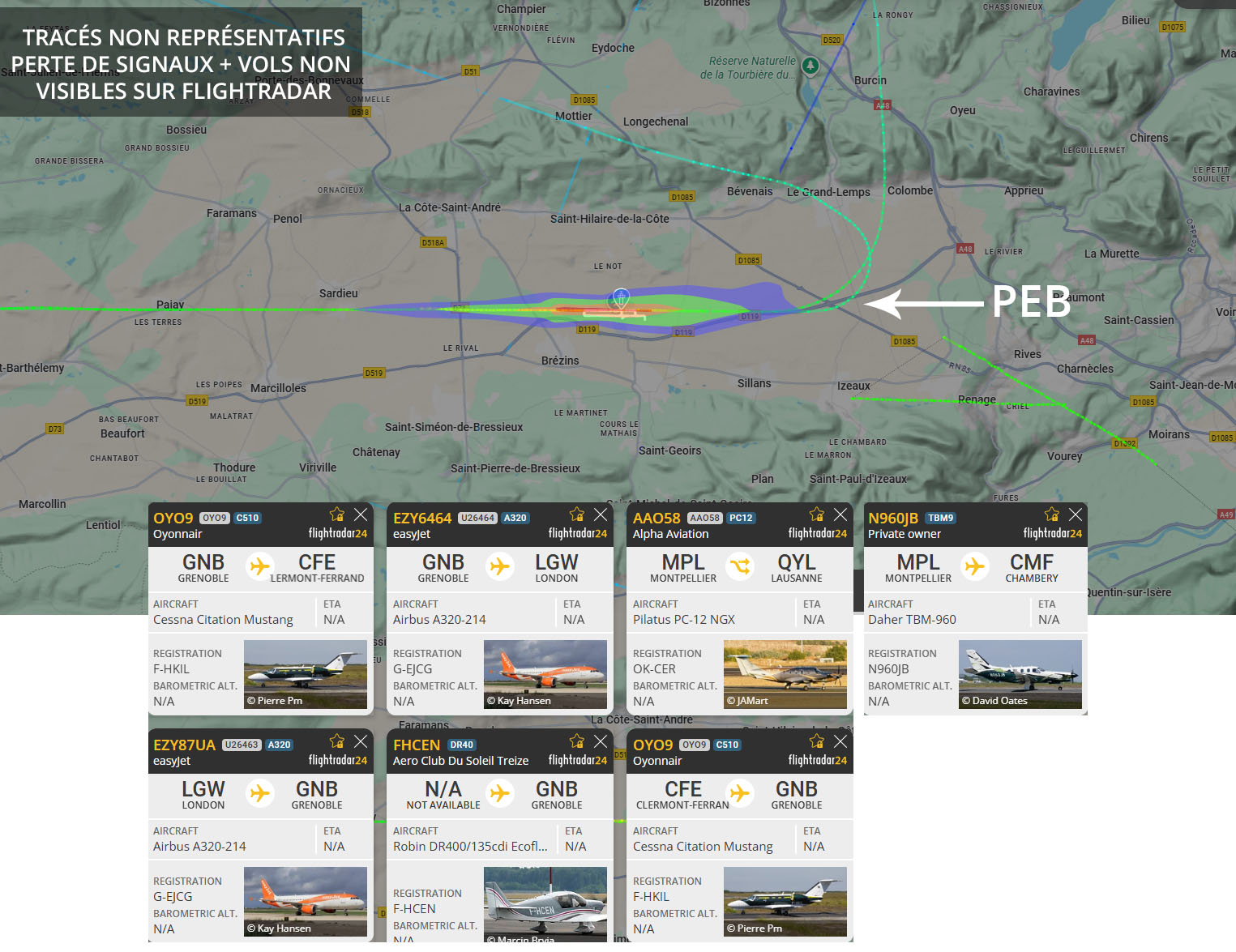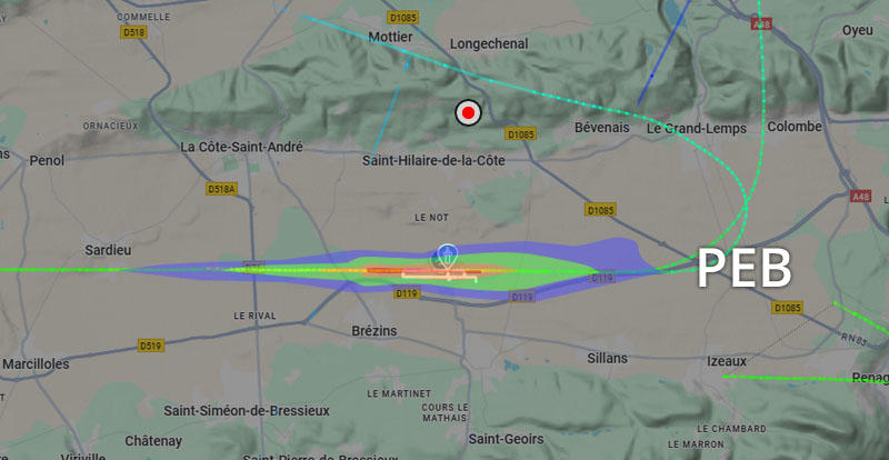 Visuel non représentatif de la réalité, perte fréquente de signaux et vols non visibles sur Flightradar. * PEB : Plan d’exposition au bruit, absolument non représentatif de la réalité.