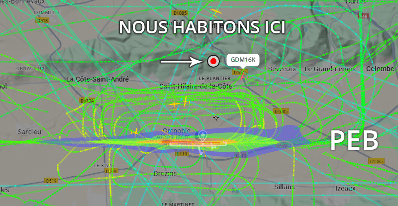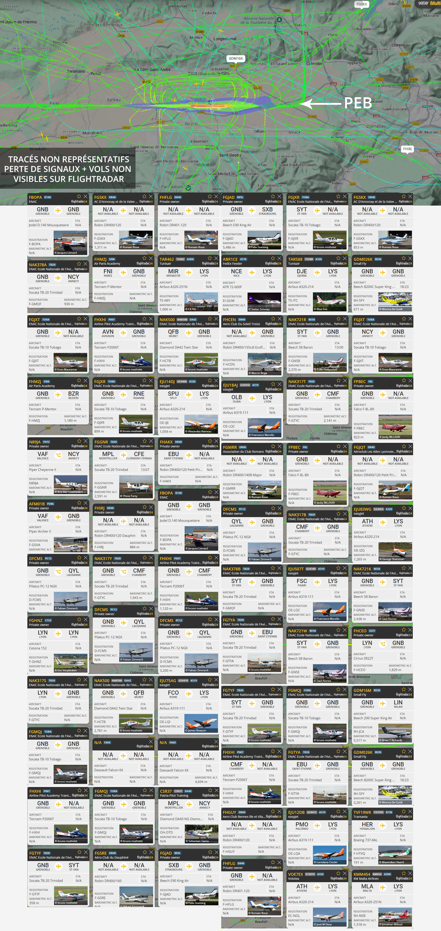 Visuel non représentatif de la réalité, perte fréquente de signaux et vols non visibles sur Flightradar. * PEB : Plan d’exposition au bruit, absolument non représentatif de la réalité.