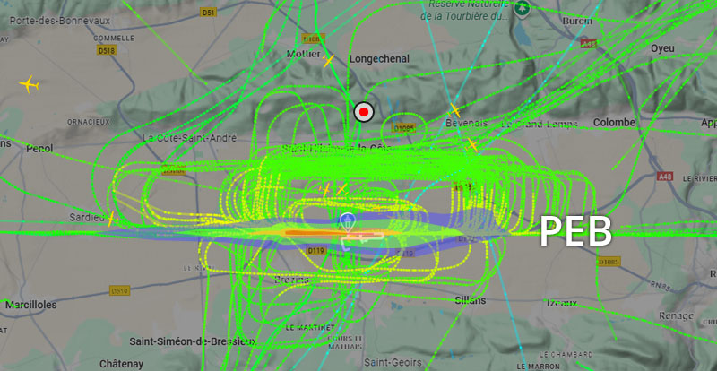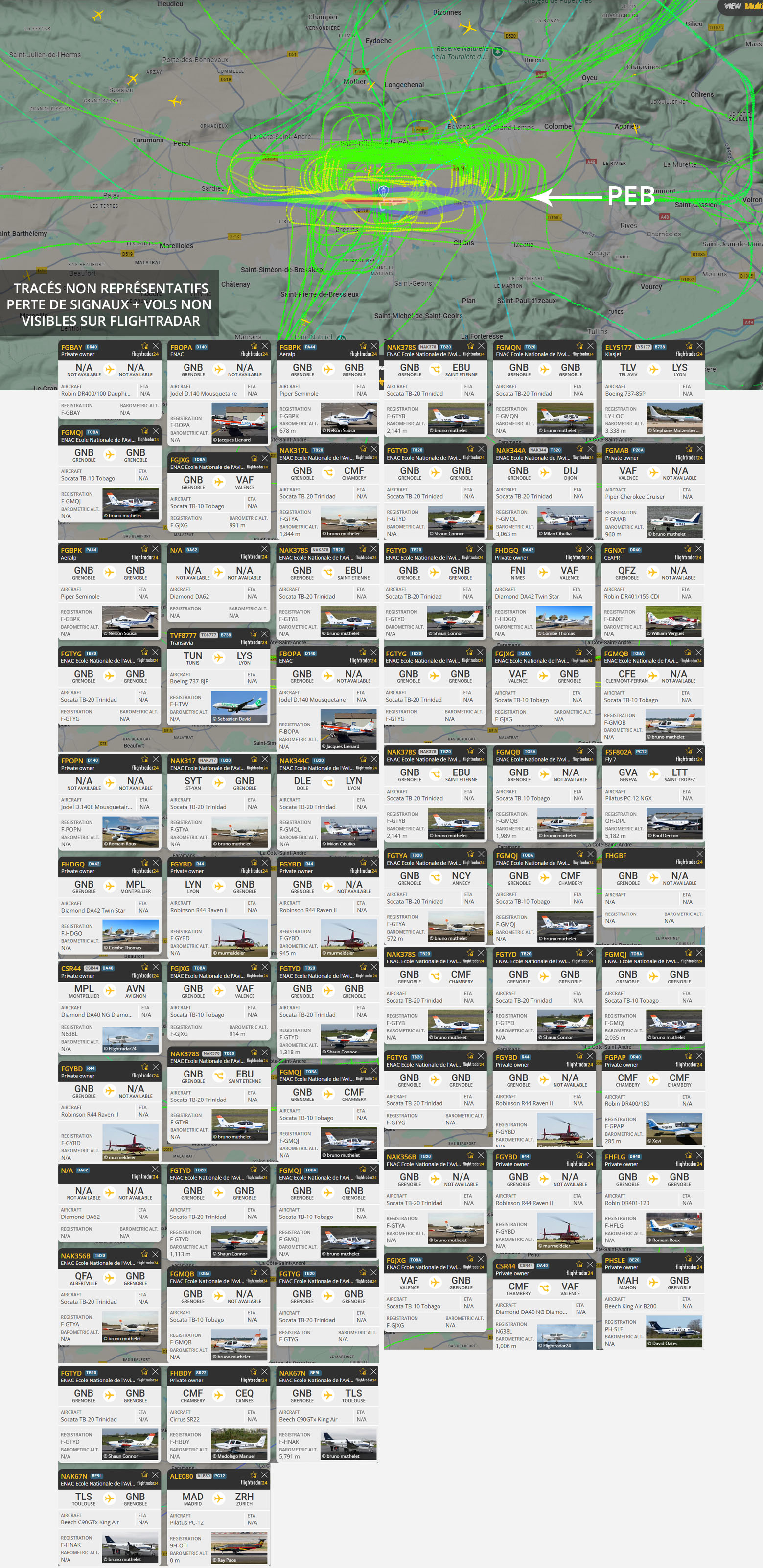 Visuel non représentatif de la réalité, perte fréquente de signaux et vols non visibles sur Flightradar. * PEB : Plan d’exposition au bruit, absolument non représentatif de la réalité.