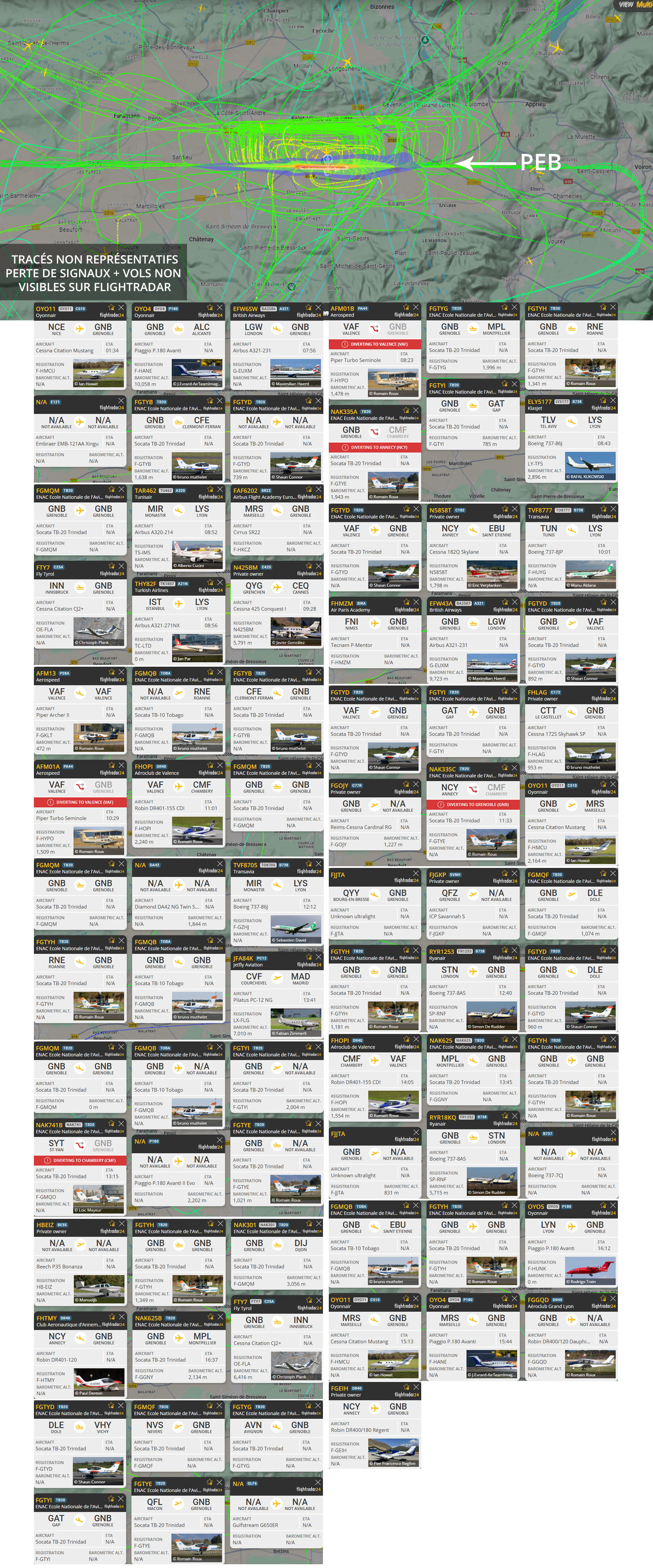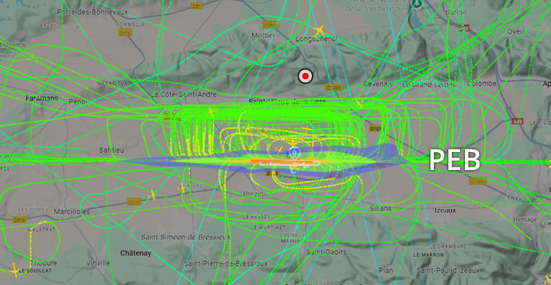 Visuel non représentatif de la réalité, perte fréquente de signaux et vols non visibles sur Flightradar. * PEB : Plan d’exposition au bruit, absolument non représentatif de la réalité.