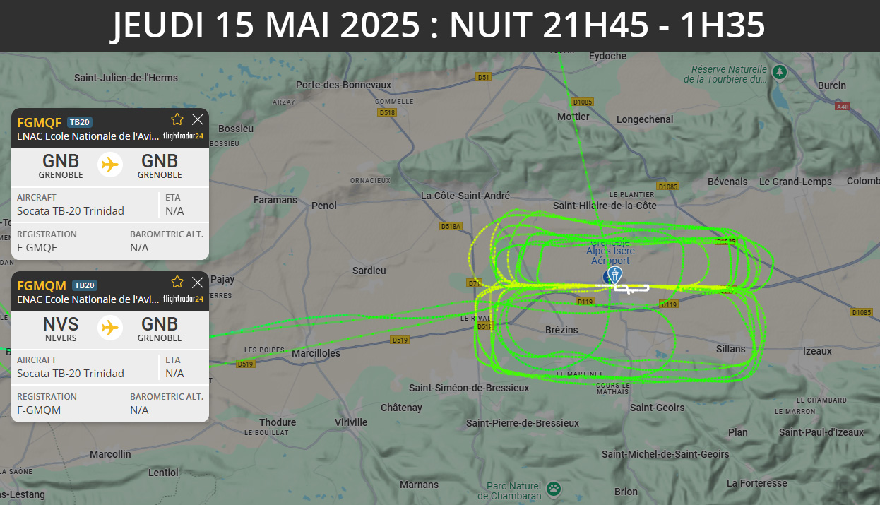 Des nuisances toute la journée, matin, midi, après-midi, nuit, jusqu’à 1h30 du matin ! Où est le respect des riverains ? Des tours de piste, passages bas sur les hauteurs, de l’Enac, d’hélicoptères, d’avions extérieurs… Puis de 21h45 jusqu’à 00h00 des tours de piste et nuisances de l’Enac F-GMQF F-GMQM. Et comme le jour précédent, décollage à 00h30, petite ballade à Bron, puis de retour à 1h25 avec un dernier tour de piste. Le F-GMQM a suivi avec un dernier tour de piste et atterrissage à 1h35. Nous avons donc vécu des nuisances nocturnes 4 nuits d’affilées…