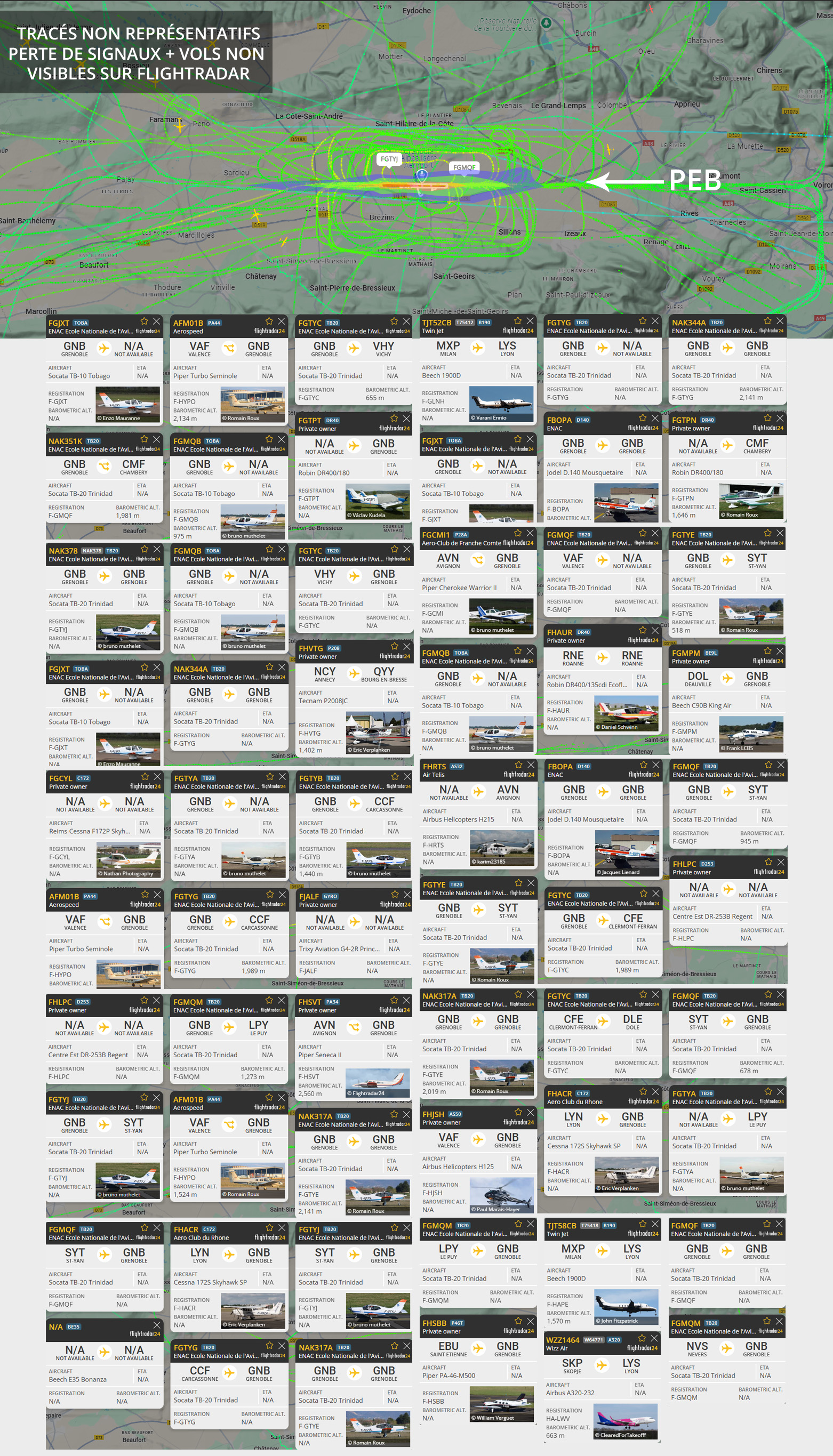 Visuel non représentatif de la réalité, perte fréquente de signaux et vols non visibles sur Flightradar. * PEB : Plan d’exposition au bruit, absolument non représentatif de la réalité.