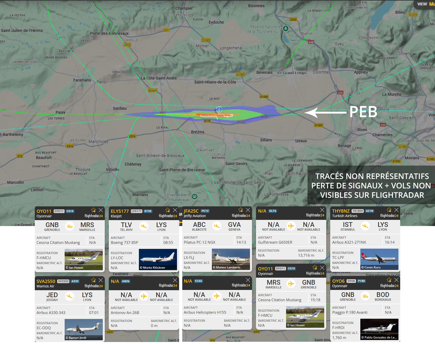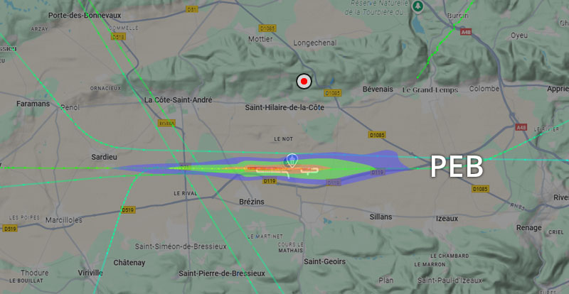 Visuel non représentatif de la réalité, perte fréquente de signaux et vols non visibles sur Flightradar. * PEB : Plan d’exposition au bruit, absolument non représentatif de la réalité.