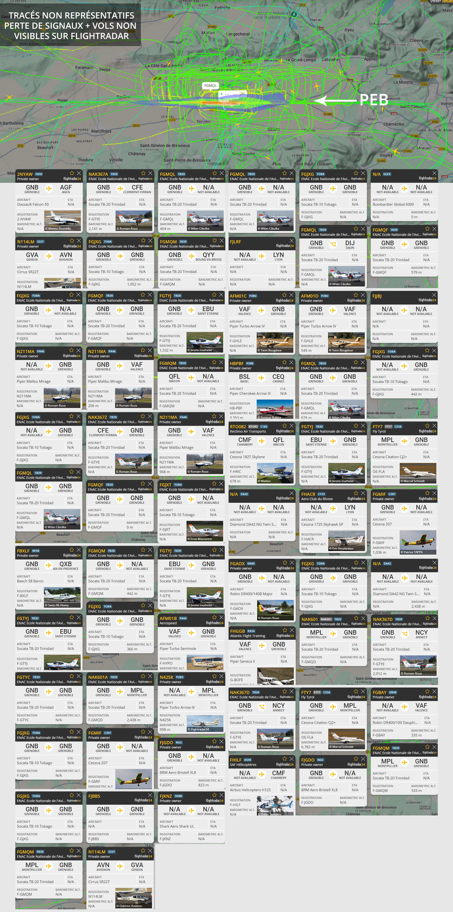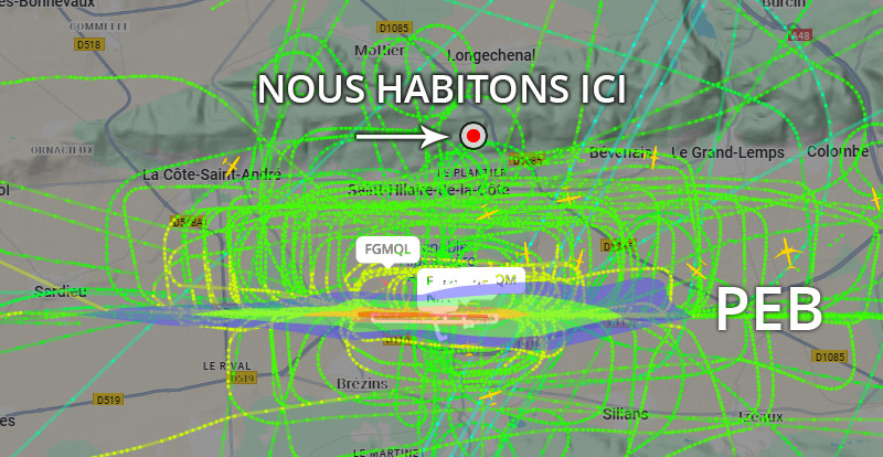 Visuel non représentatif de la réalité, perte fréquente de signaux et vols non visibles sur Flightradar. * PEB : Plan d’exposition au bruit, absolument non représentatif de la réalité
