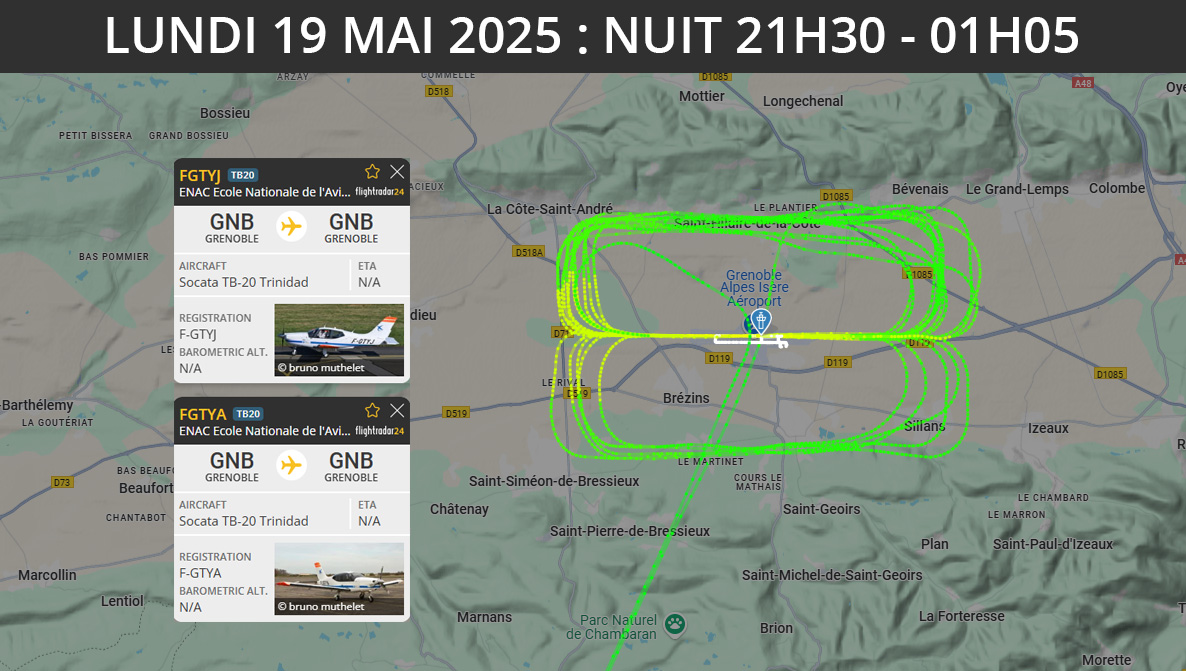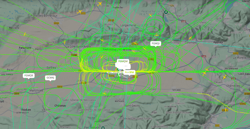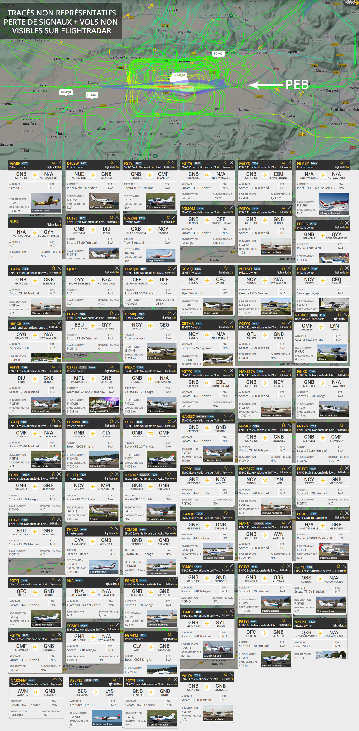 Visuel non représentatif de la réalité, perte fréquente de signaux et vols non visibles sur Flightradar. * PEB : Plan d’exposition au bruit, absolument non représentatif de la réalité.