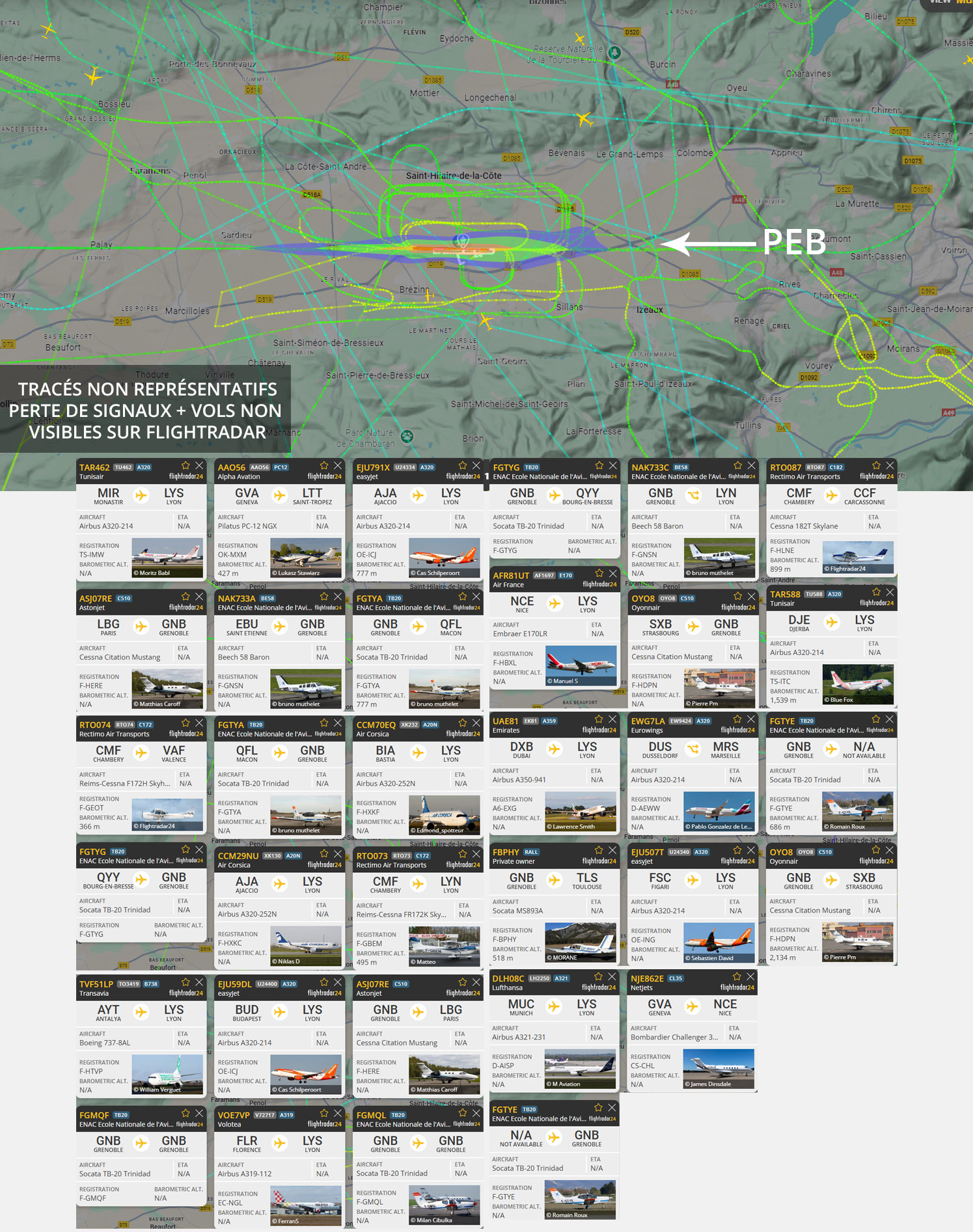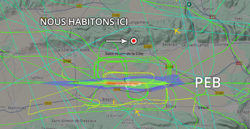 Visuel non représentatif de la réalité, perte fréquente de signaux et vols non visibles sur Flightradar. * PEB : Plan d’exposition au bruit, absolument non représentatif de la réalité.