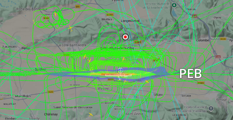 Visuel non représentatif de la réalité, perte fréquente de signaux et vols non visibles sur Flightradar. * PEB : Plan d’exposition au bruit, absolument non représentatif de la réalité.
