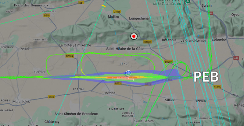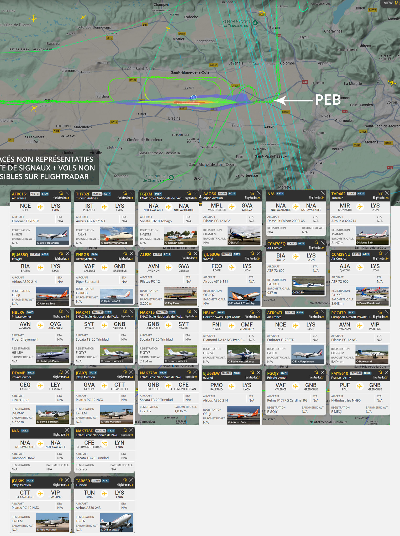 Visuel non représentatif de la réalité, perte fréquente de signaux et vols non visibles sur Flightradar. * PEB : Plan d’exposition au bruit, absolument non représentatif de la réalité.