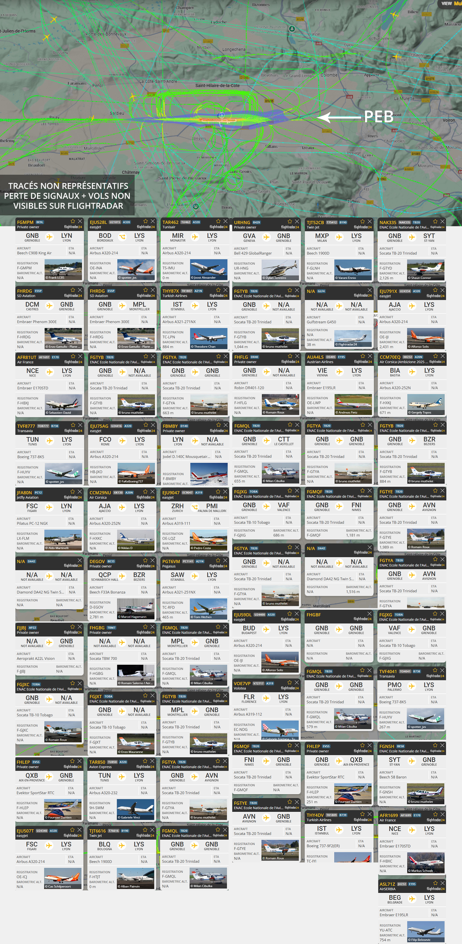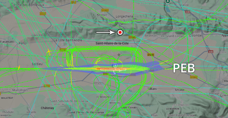 Visuel non représentatif de la réalité, perte fréquente de signaux et vols non visibles sur Flightradar. * PEB : Plan d’exposition au bruit, absolument non représentatif de la réalité.