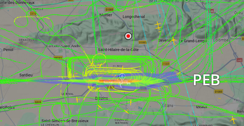 Visuel non représentatif de la réalité, perte fréquente de signaux et vols non visibles sur Flightradar. * PEB : Plan d’exposition au bruit, absolument non représentatif de la réalité.
