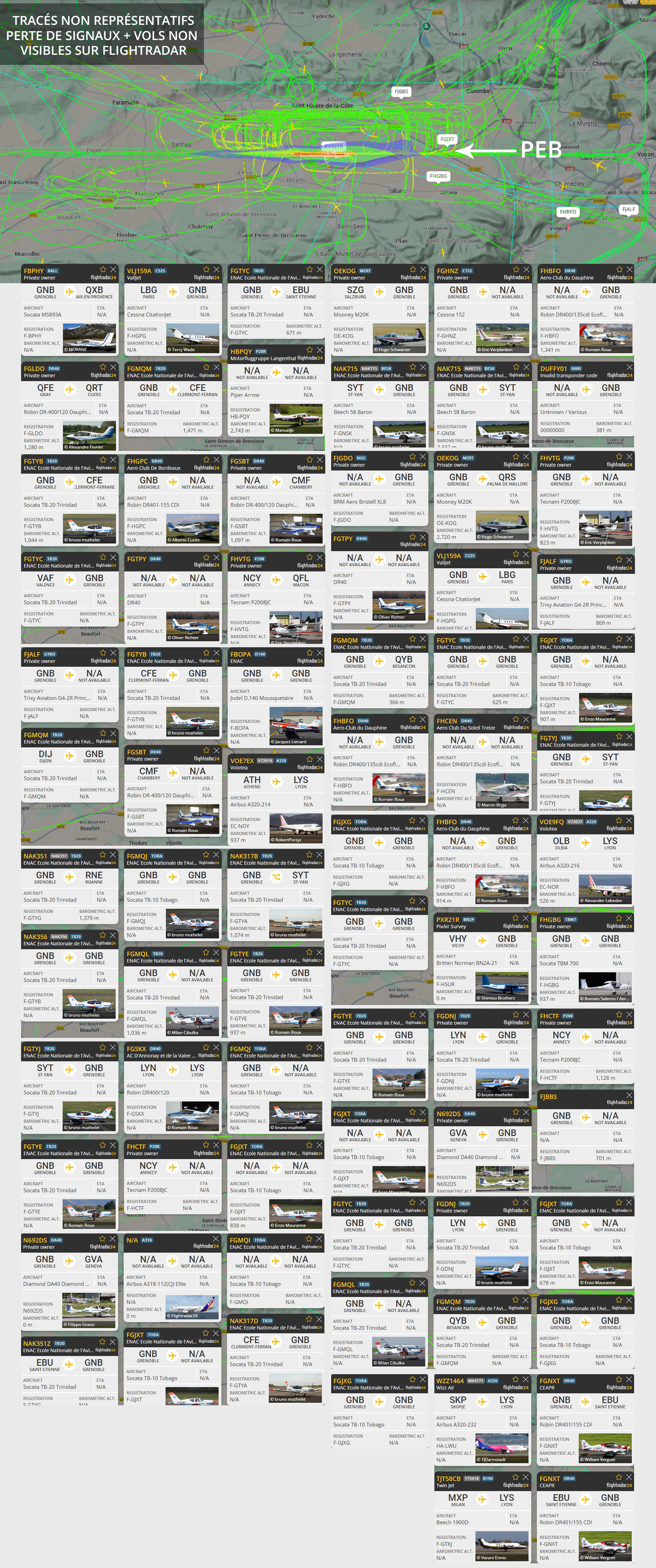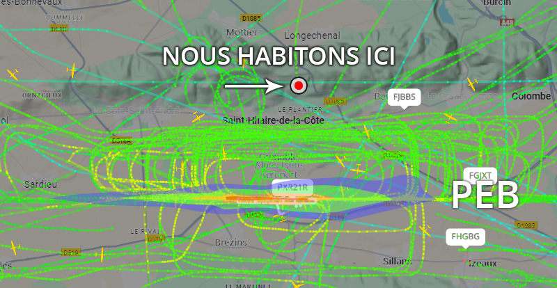 Visuel non représentatif de la réalité, perte fréquente de signaux et vols non visibles sur Flightradar. * PEB : Plan d’exposition au bruit, absolument non représentatif de la réalité