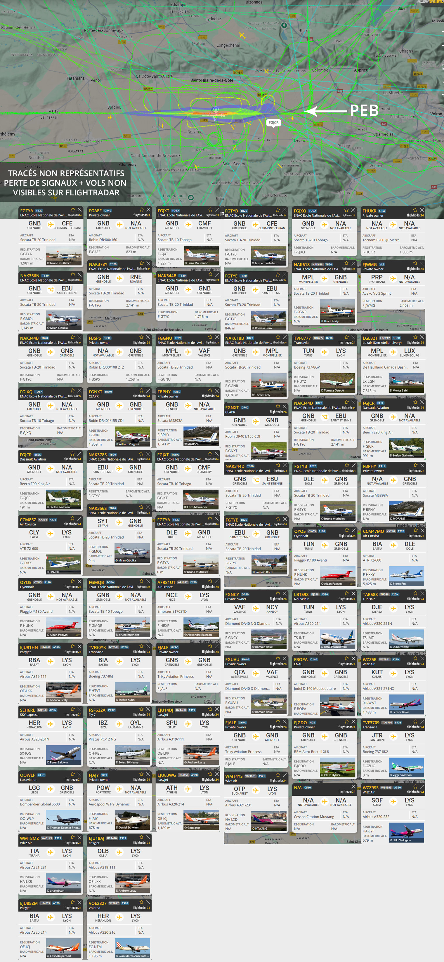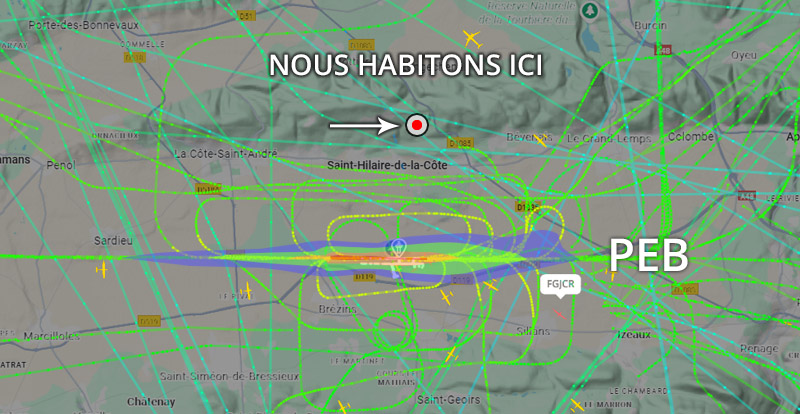 Visuel non représentatif de la réalité, perte fréquente de signaux et vols non visibles sur Flightradar. * PEB : Plan d’exposition au bruit, absolument non représentatif de la réalité.