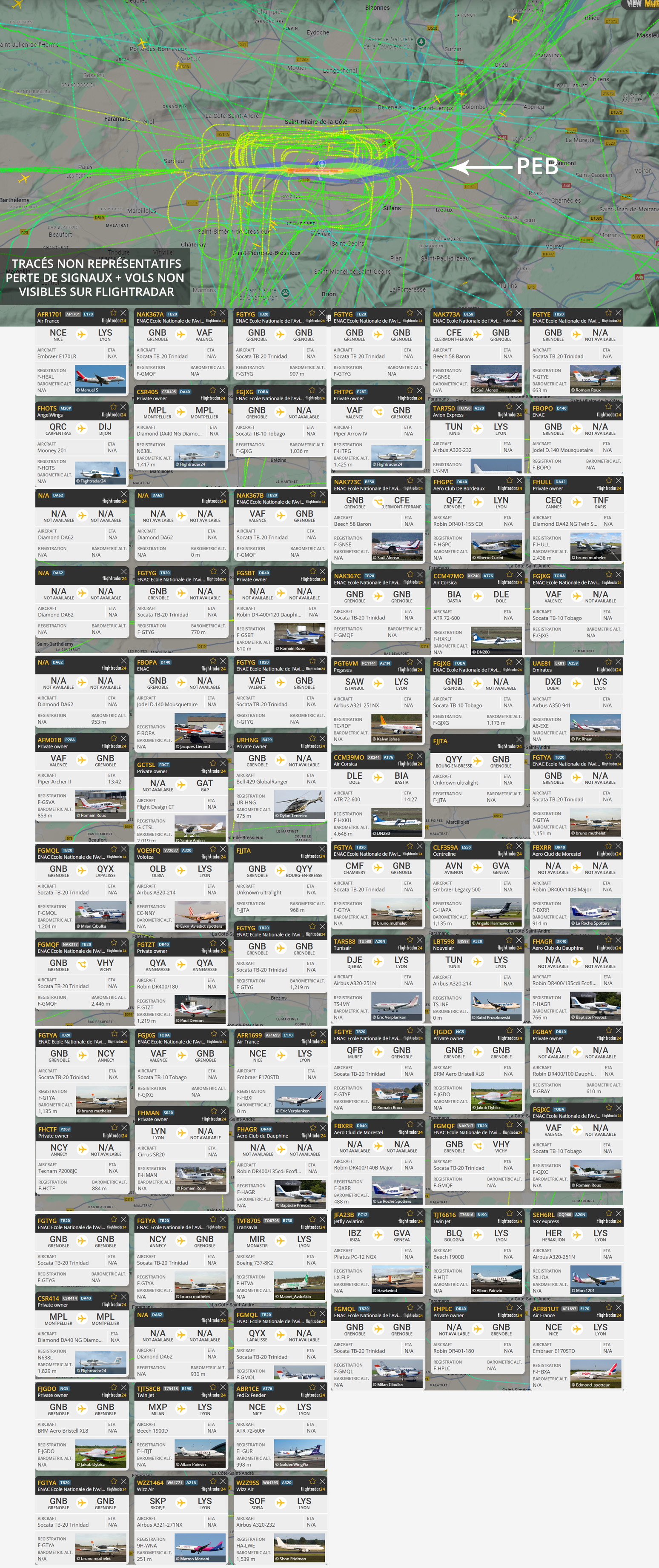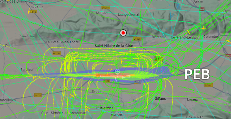 Visuel non représentatif de la réalité, perte fréquente de signaux et vols non visibles sur Flightradar. * PEB : Plan d’exposition au bruit, absolument non représentatif de la réalité.