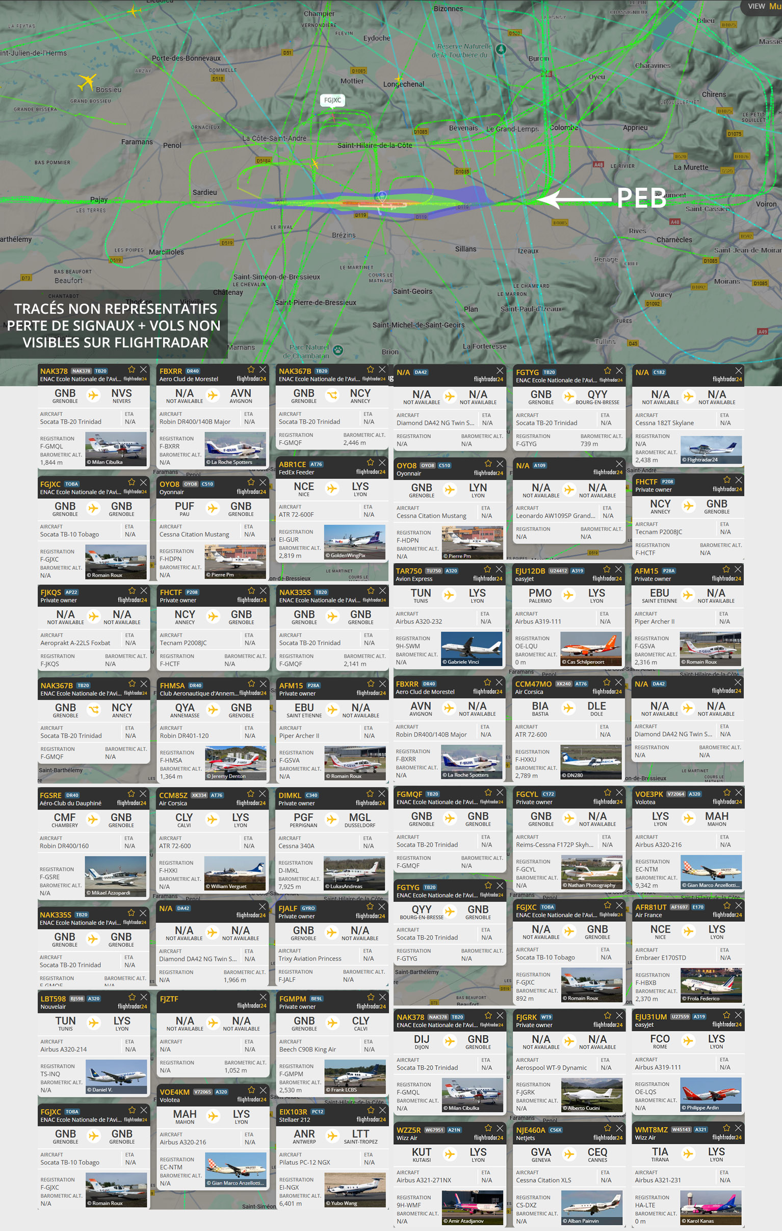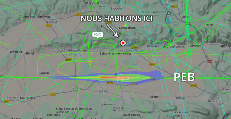 Visuel non représentatif de la réalité, perte fréquente de signaux et vols non visibles sur Flightradar. * PEB : Plan d’exposition au bruit, absolument non représentatif de la réalité.