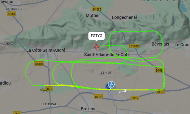 Des nuisances toute la journée, matin, midi, après-midi, surtout au nord de l’aéroport… Des tours de piste toute la journée bien larges de l’Enac (F-GTYG), uniquement au nord, aucune alternance, c’est usant. Et pourquoi ces demi-tours et pseudo tour de piste sur les hauteurs de Saint-Hilaire de la Côte ? Donc plusieurs passages sur les hauteurs de l’Enac (F-GTYG, F-GMQL), plusieurs passages également d’un jet Pilatus YR-WLF (à son arrivé, passage sur les hauteurs puis atterrissage et ensuite après son décollage : virage serré, passage bas sur les hauteurs), passage du F-HVTG d’Annecy. Des nuisances également de l’hélicoptère d’Albertville 9H-GMF (avec passage sur les hauteurs), passage d’un Diamond F-HPRA, des nuisances d’avions extérieurs et d’avions en approche sur Lyon.