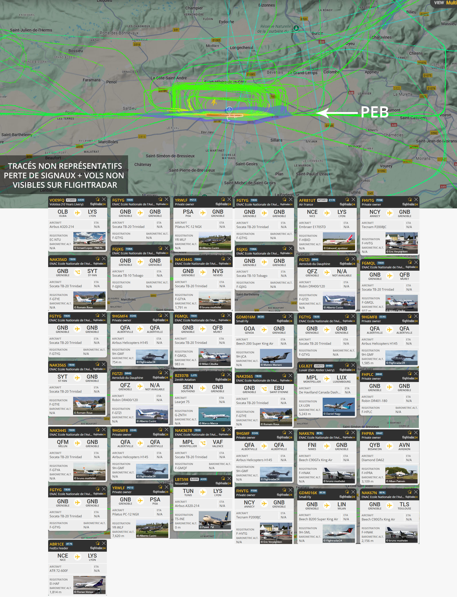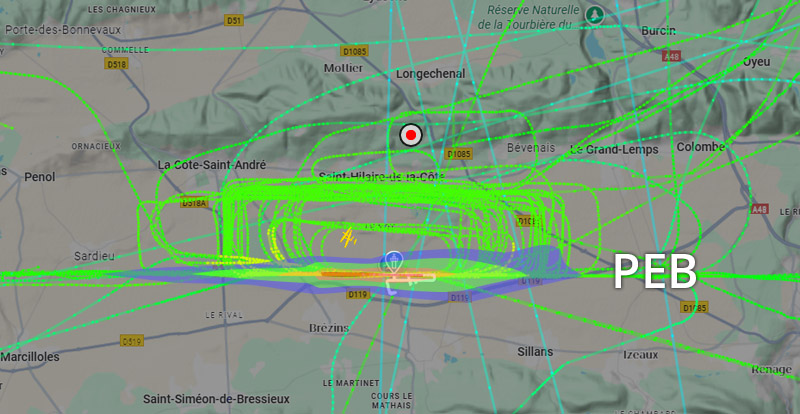Visuel non représentatif de la réalité, perte fréquente de signaux et vols non visibles sur Flightradar. * PEB : Plan d’exposition au bruit, absolument non représentatif de la réalité.