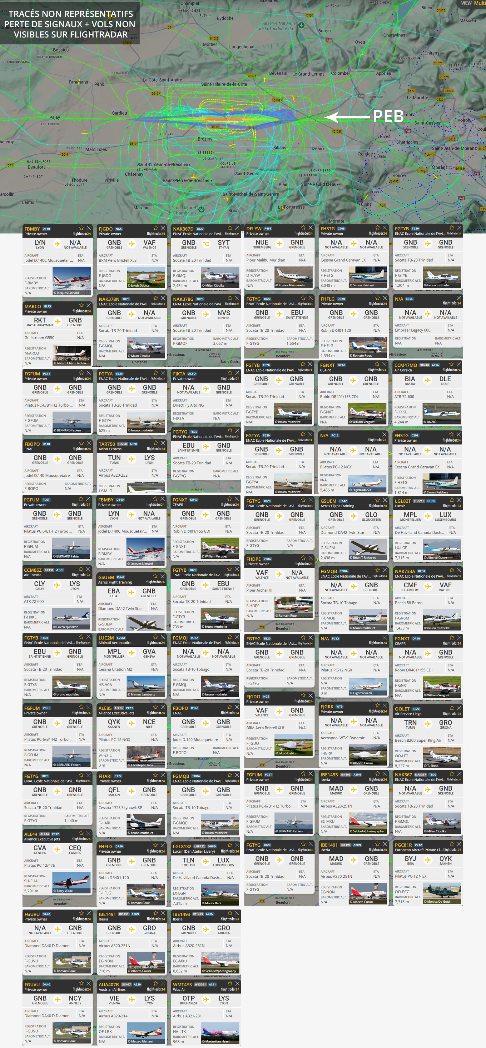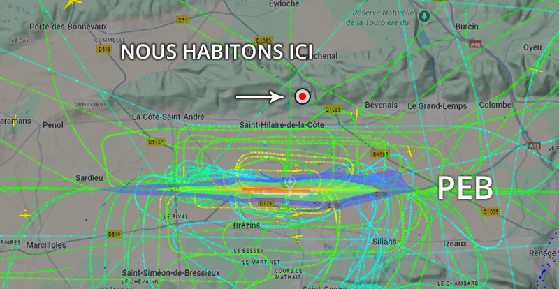 Visuel non représentatif de la réalité, perte fréquente de signaux et vols non visibles sur Flightradar. * PEB : Plan d’exposition au bruit, absolument non représentatif de la réalité.