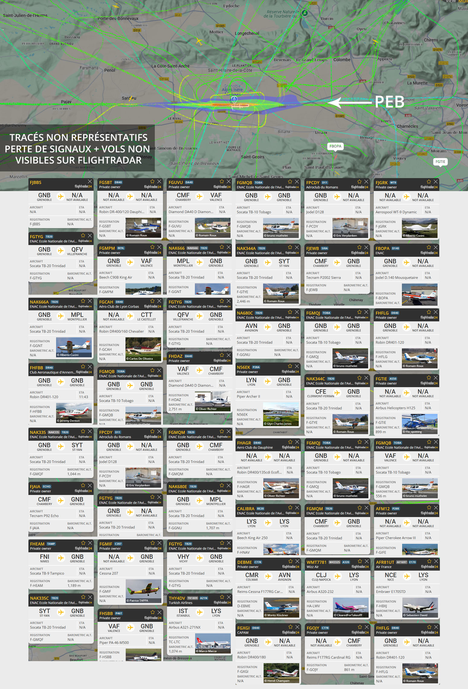 Visuel non représentatif de la réalité, perte fréquente de signaux et vols non visibles sur Flightradar. * PEB : Plan d’exposition au bruit, absolument non représentatif de la réalité.
