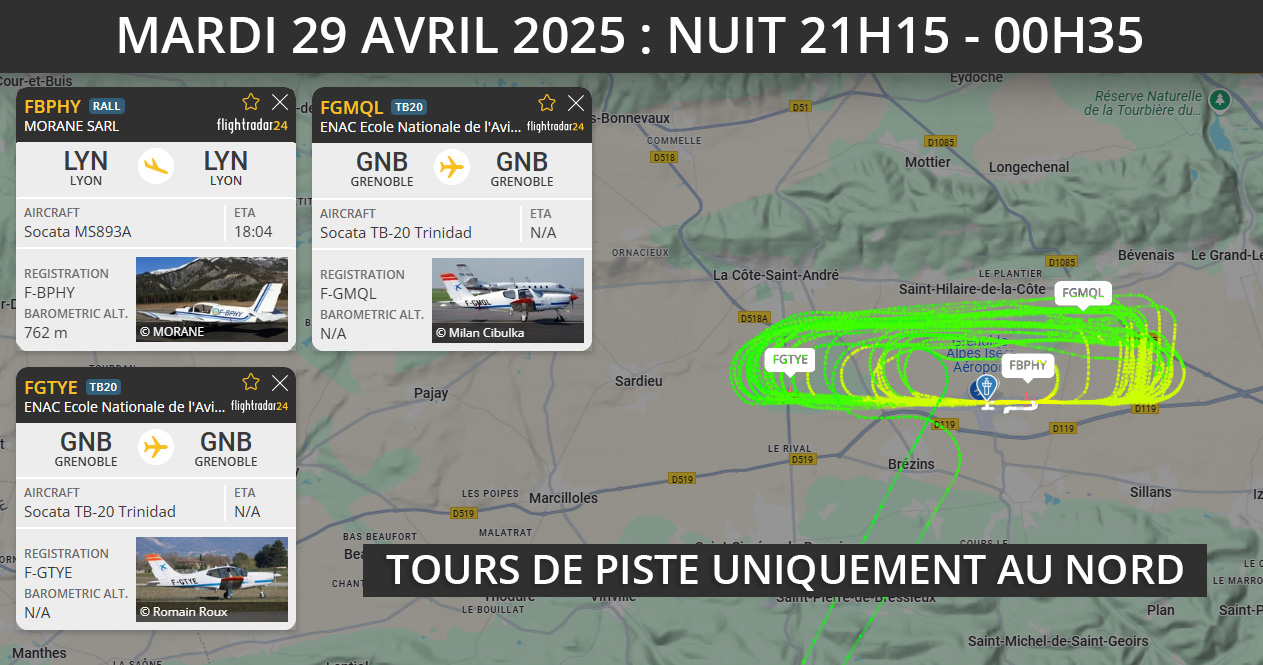 Et 2ème nuit d’affilée de tours de piste et de nuisances jusqu’à 00h35 !!! 3 avions faisaient des tours de piste, à très basse altitude, les mêmes qu’en plein jour (ne doivent ils pas voler plus haut la nuit ?…), 2 de l’ENAC F-GTYE F-GMQL et 1 de Morane Aero F-BPHY. À 23h30, on pense que c’est fini et non, à 23h40, un avion de l’Enac redécolle, tour de piste, puis à 00h00 il est parti faire des tours de piste à Valence pour revenir à 00h35. C’est vraiment irrespectueux envers les riverains.