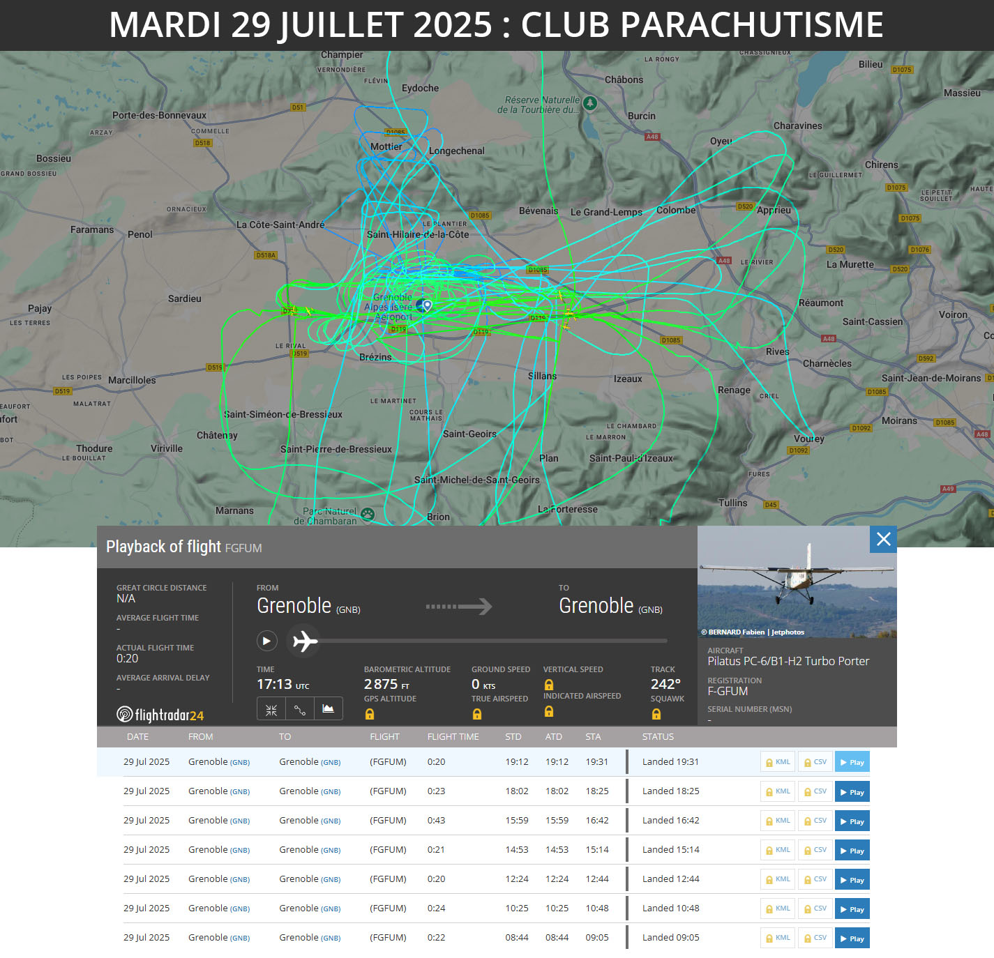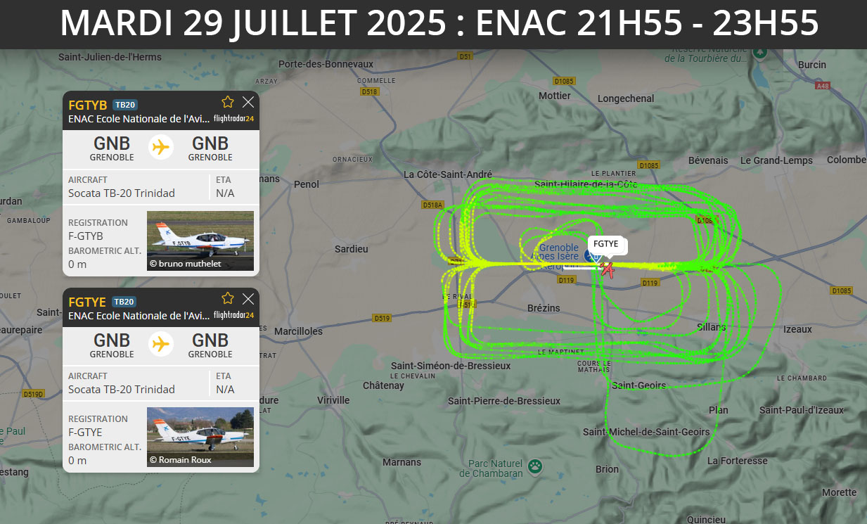 Des nuisances toute la journée, matin, midi, après-midi, soir, nuit, jusqu’à minuit ! Des nuisances de l’Enac (tours de piste, passages sur les hauteurs), des nuisances du club de parachutisme avec le F-GFUM jusqu’à 19h50 (nombreux passages et nombreuses boucles). Des passages également sur les hauteurs d’avions extérieurs (avion Suisse HB-DHI, propriétaire privé F-PCAI), d’hélicoptères (non immatriculé) et d’avions en approche sur Lyon. La nuit, comme la veille, tours de piste de l’Enac (F-GTYB et F-GTYE) jusqu’à 23h55.