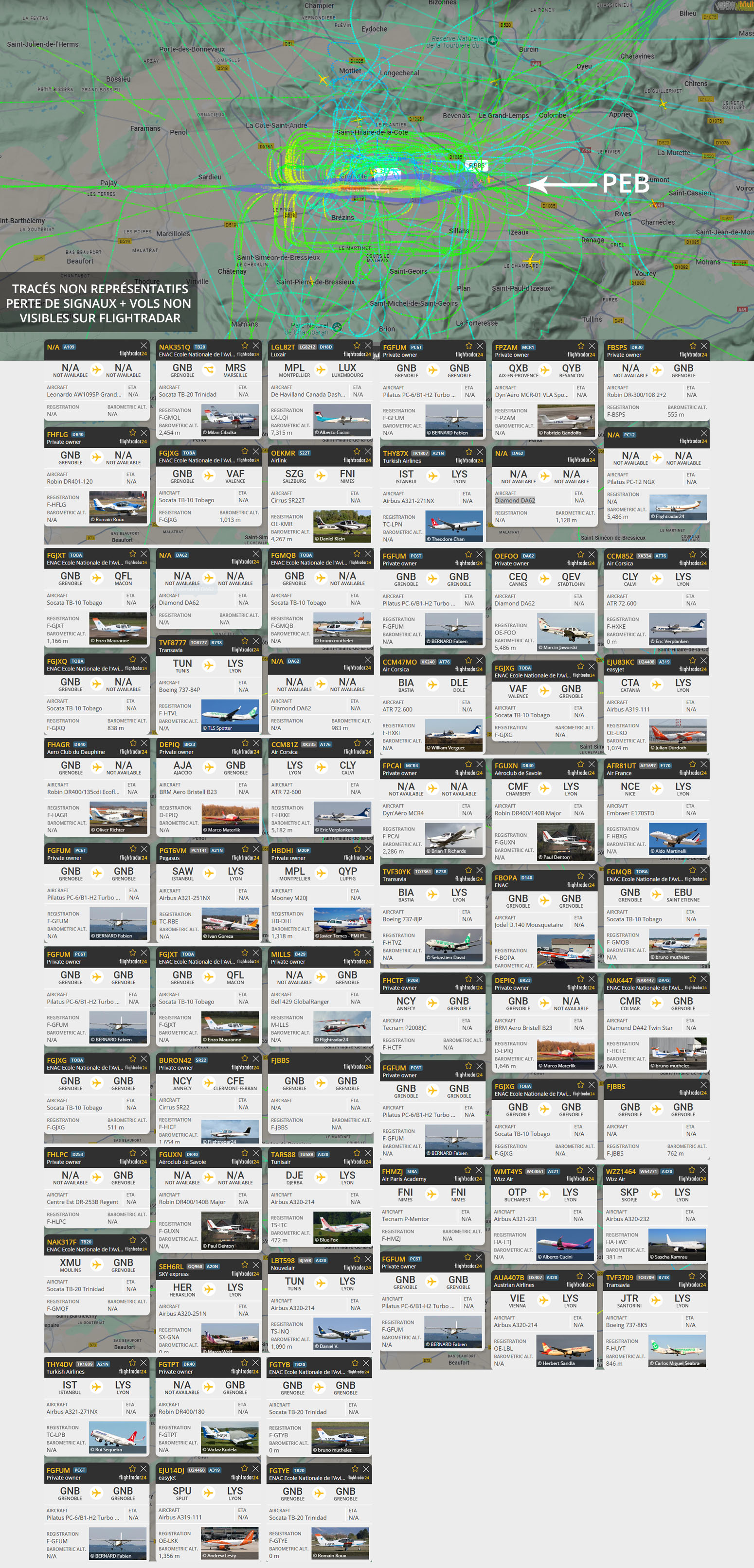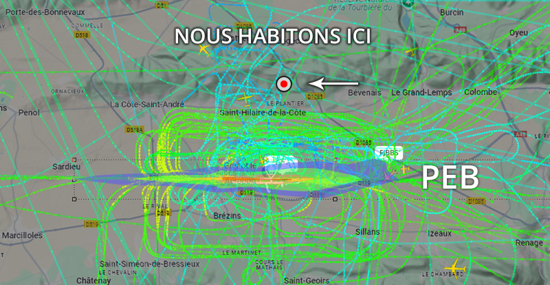 Visuel non représentatif de la réalité, perte fréquente de signaux et vols non visibles sur Flightradar. * PEB : Plan d’exposition au bruit, absolument non représentatif de la réalité.
