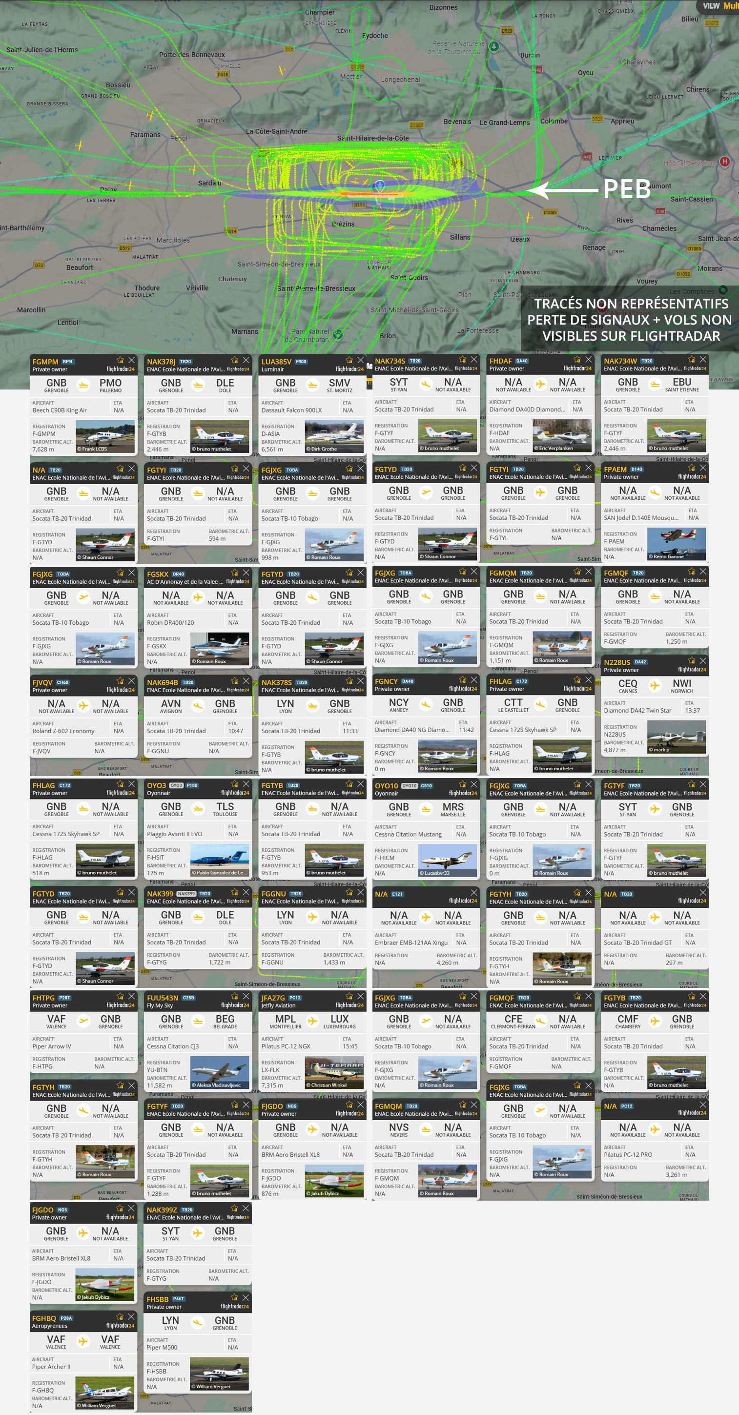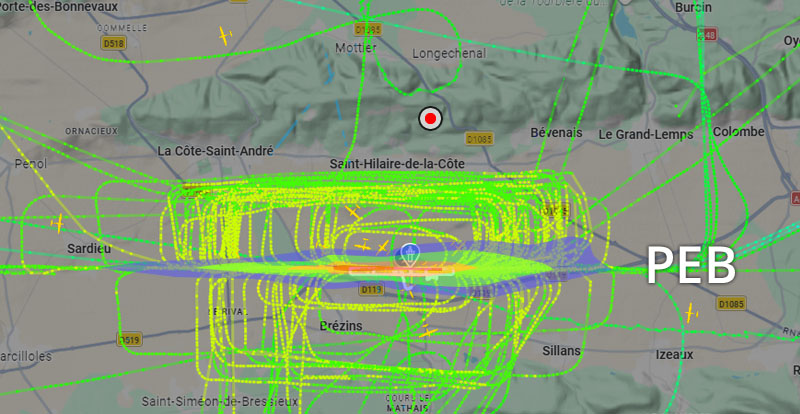 Visuel non représentatif de la réalité, perte fréquente de signaux et vols non visibles sur Flightradar. * PEB : Plan d’exposition au bruit, absolument non représentatif de la réalité.