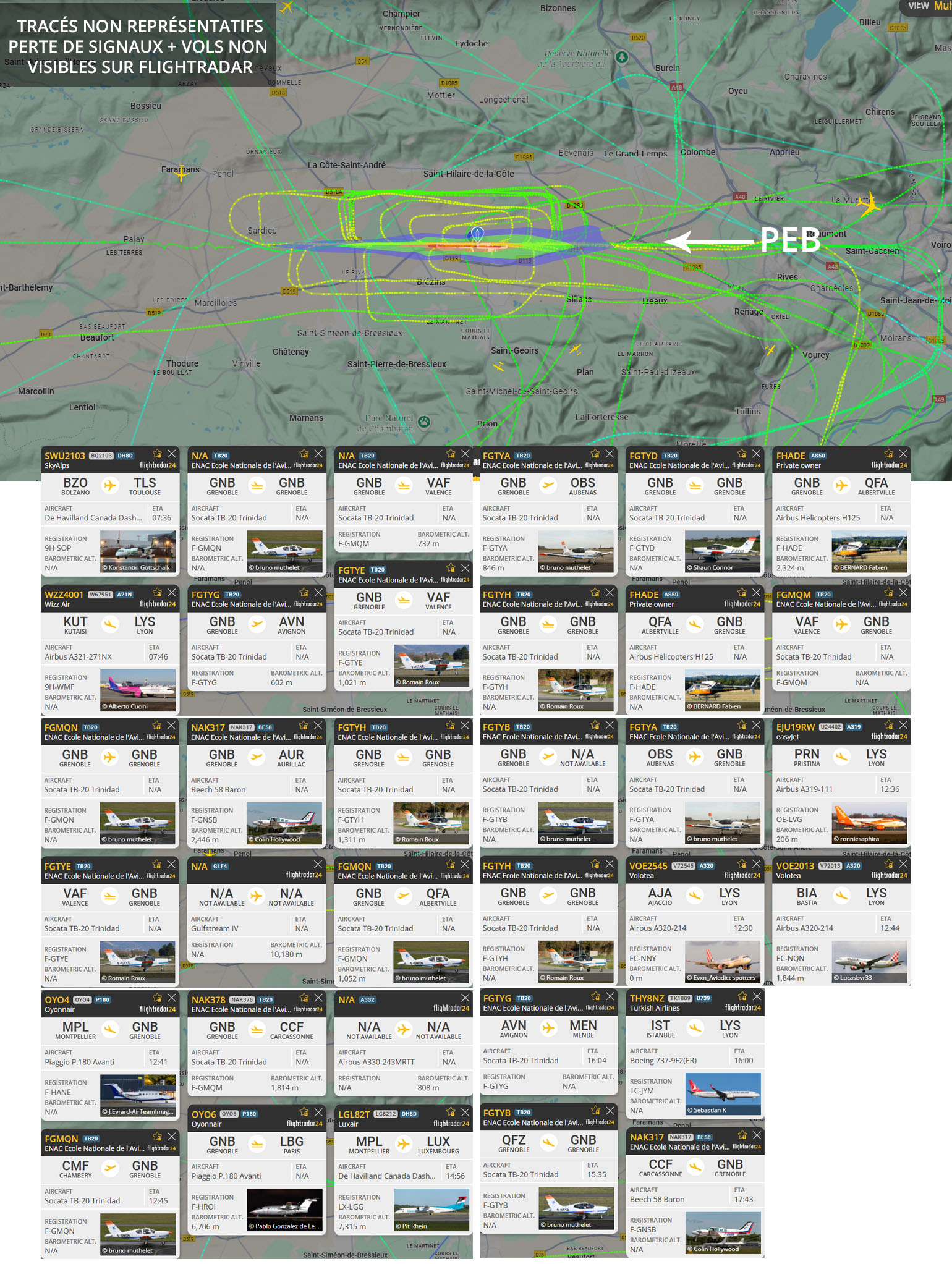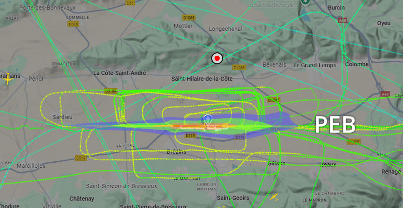 Visuel non représentatif de la réalité, perte fréquente de signaux et vols non visibles sur Flightradar. * PEB : Plan d’exposition au bruit, absolument non représentatif de la réalité.