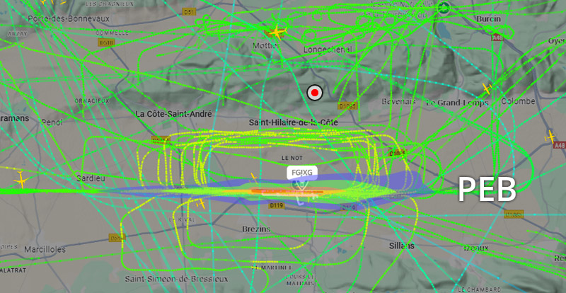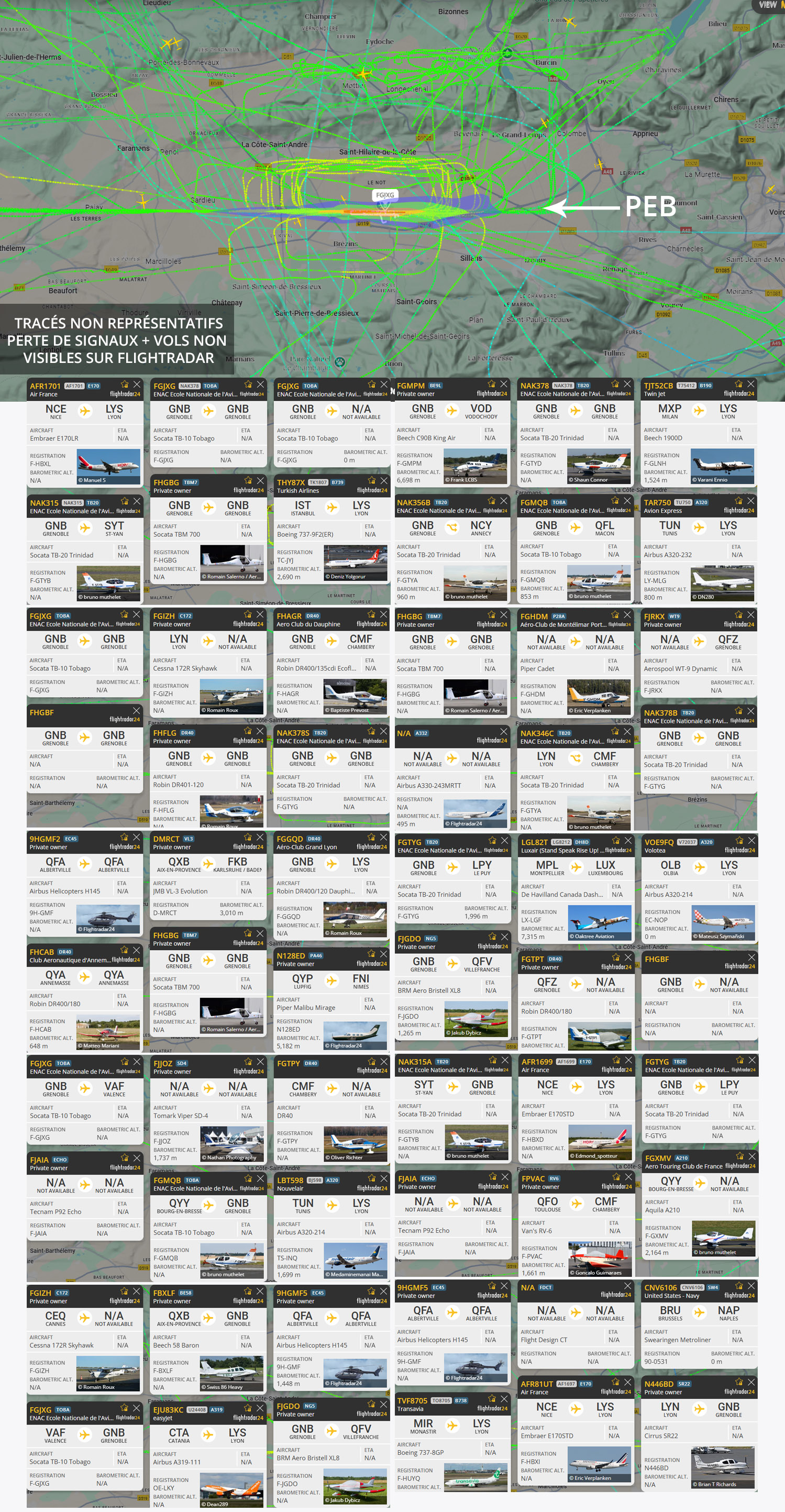 Visuel non représentatif de la réalité, perte fréquente de signaux et vols non visibles sur Flightradar. * PEB : Plan d’exposition au bruit, absolument non représentatif de la réalité.