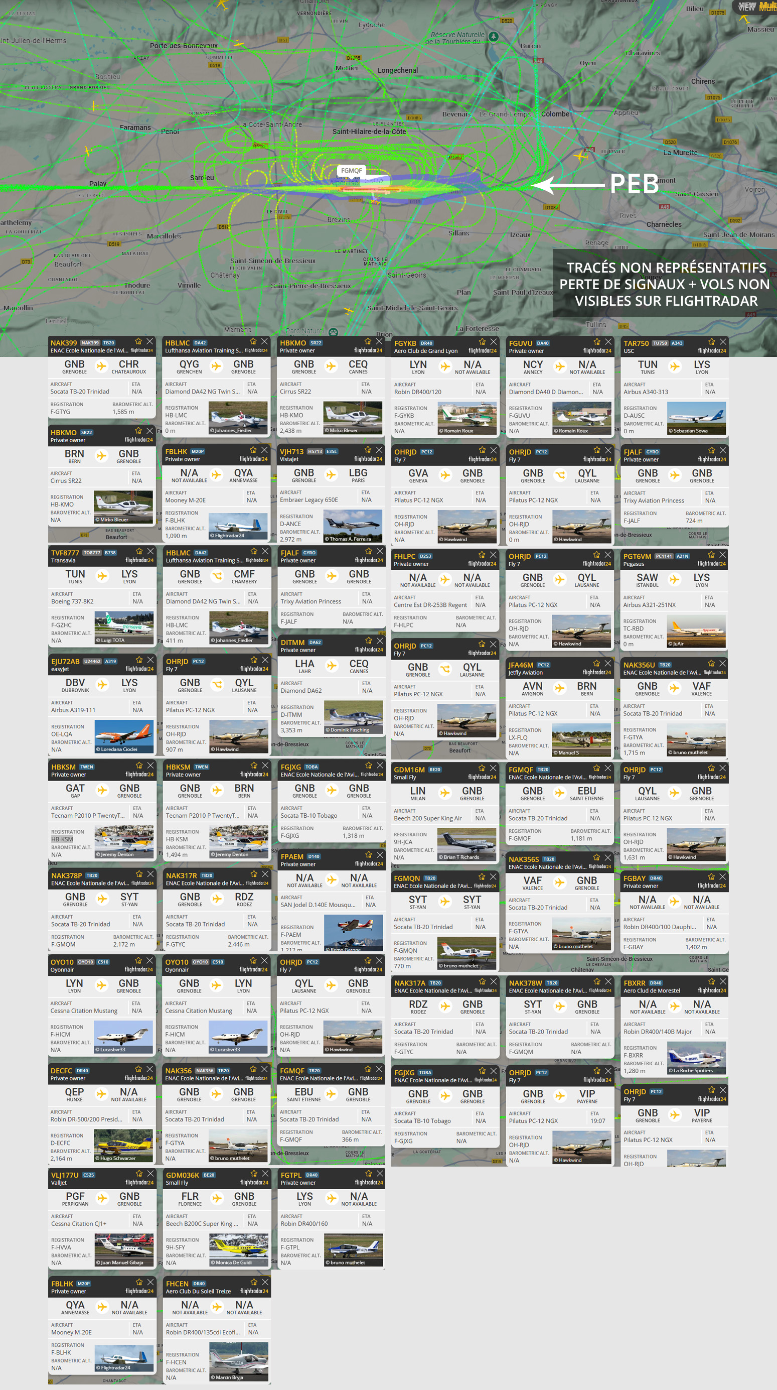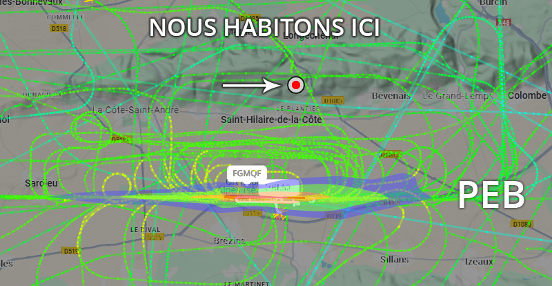 Visuel non représentatif de la réalité, perte fréquente de signaux et vols non visibles sur Flightradar. * PEB : Plan d’exposition au bruit, absolument non représentatif de la réalité.