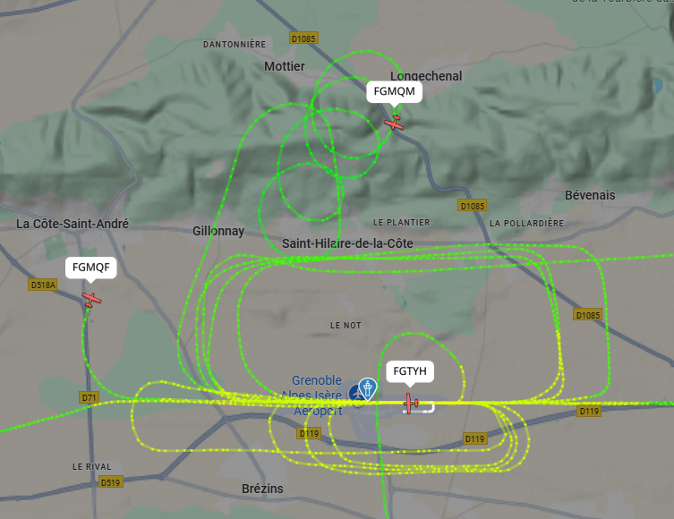 Encore une journée en enfer… Des tours de piste de l’Enac toute la journée, jusqu’à 4 avions, encore, uniquement au nord, aucune alternance, des nuisances continues toute la journée. Des très très nombreuses boucles de l’Enac également (F-GMQM TB20 classe acoustique D, la pire), sur les hauteurs de Saint Hilaire de la Côte, à plusieurs reprises dans l’après-midi. Pourquoi subissons-nous autant ces nuisances ? Nous existons ! Des nuisances aussi d’avions basés (Morane avec passage sur les hauteurs F-BPHY, aéroclub de Grenoble) et non basés (Annecy, Bron, Annemasse, etc…). Des nuisances d’avions non visibles sur Flightradar, des tours de piste non visibles… Des nuisances d’avions en approche, d’Oyonnair. Et en début de soirée, des tours de piste de l’aéroclub du Dauphiné avec le F-GNXT. Bref, une journée en enfer…