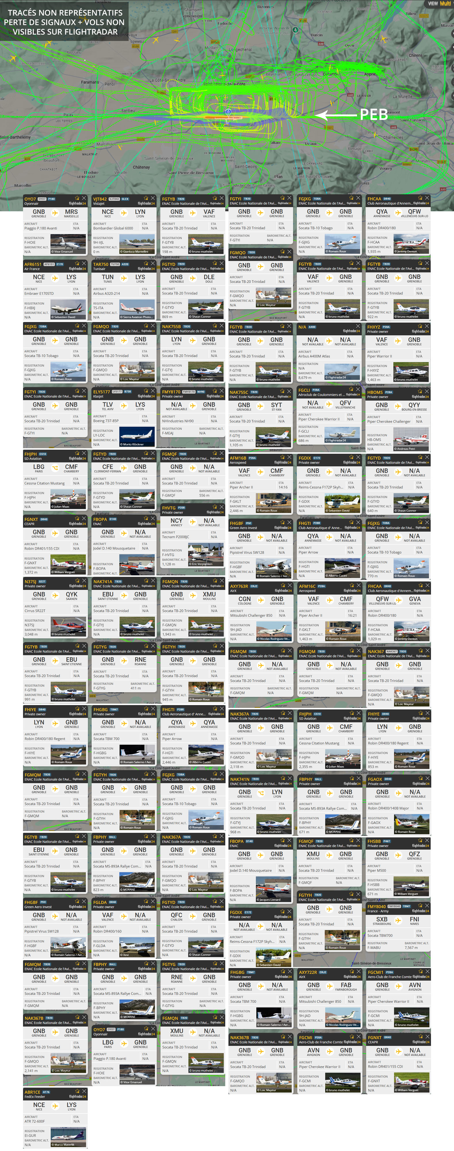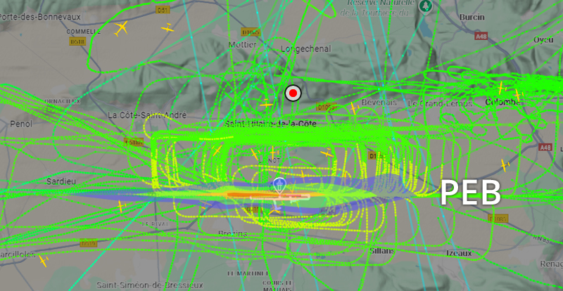 Visuel non représentatif de la réalité, perte fréquente de signaux et vols non visibles sur Flightradar. * PEB : Plan d’exposition au bruit, absolument non représentatif de la réalité.