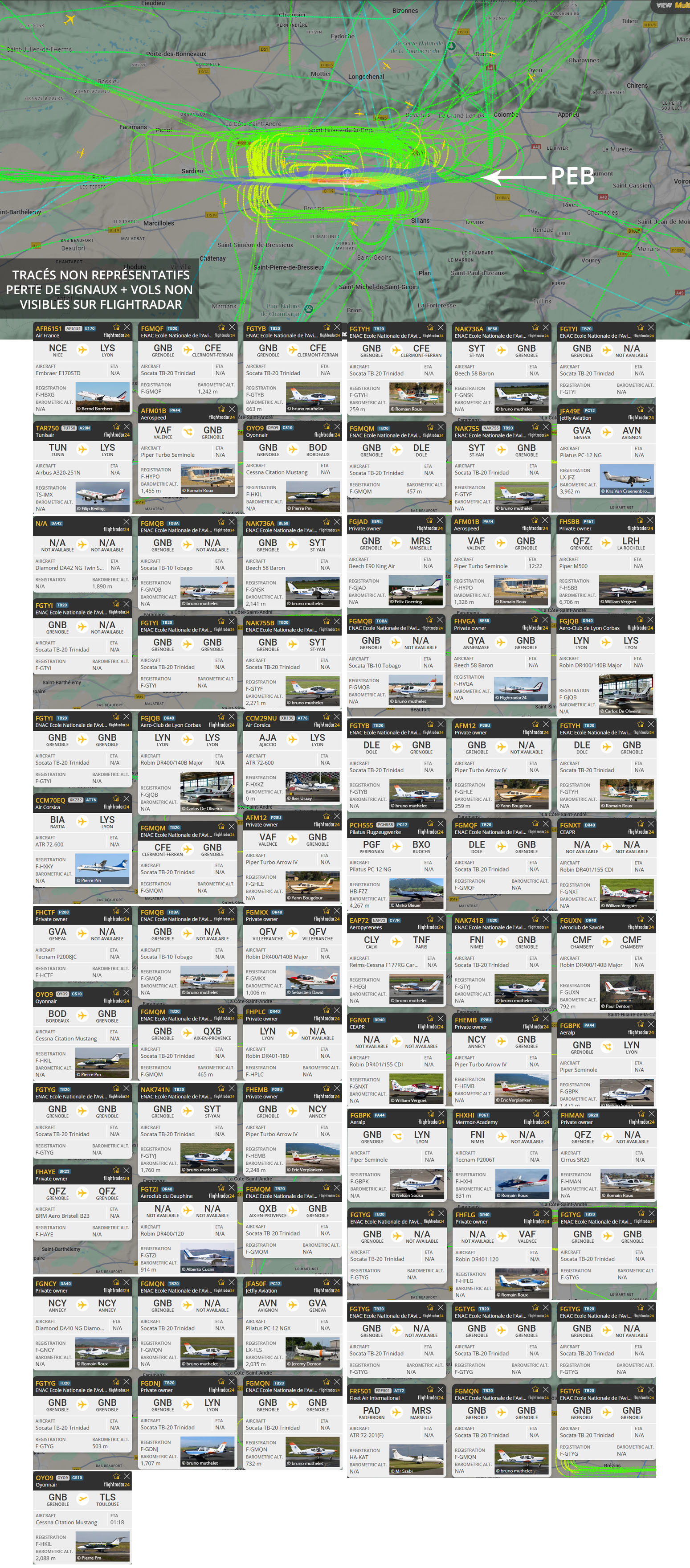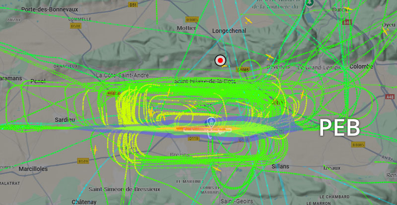 Visuel non représentatif de la réalité, perte fréquente de signaux et vols non visibles sur Flightradar. * PEB : Plan d’exposition au bruit, absolument non représentatif de la réalité.