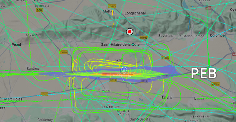 Visuel non représentatif de la réalité, perte fréquente de signaux et vols non visibles sur Flightradar. * PEB : Plan d’exposition au bruit, absolument non représentatif de la réalité.