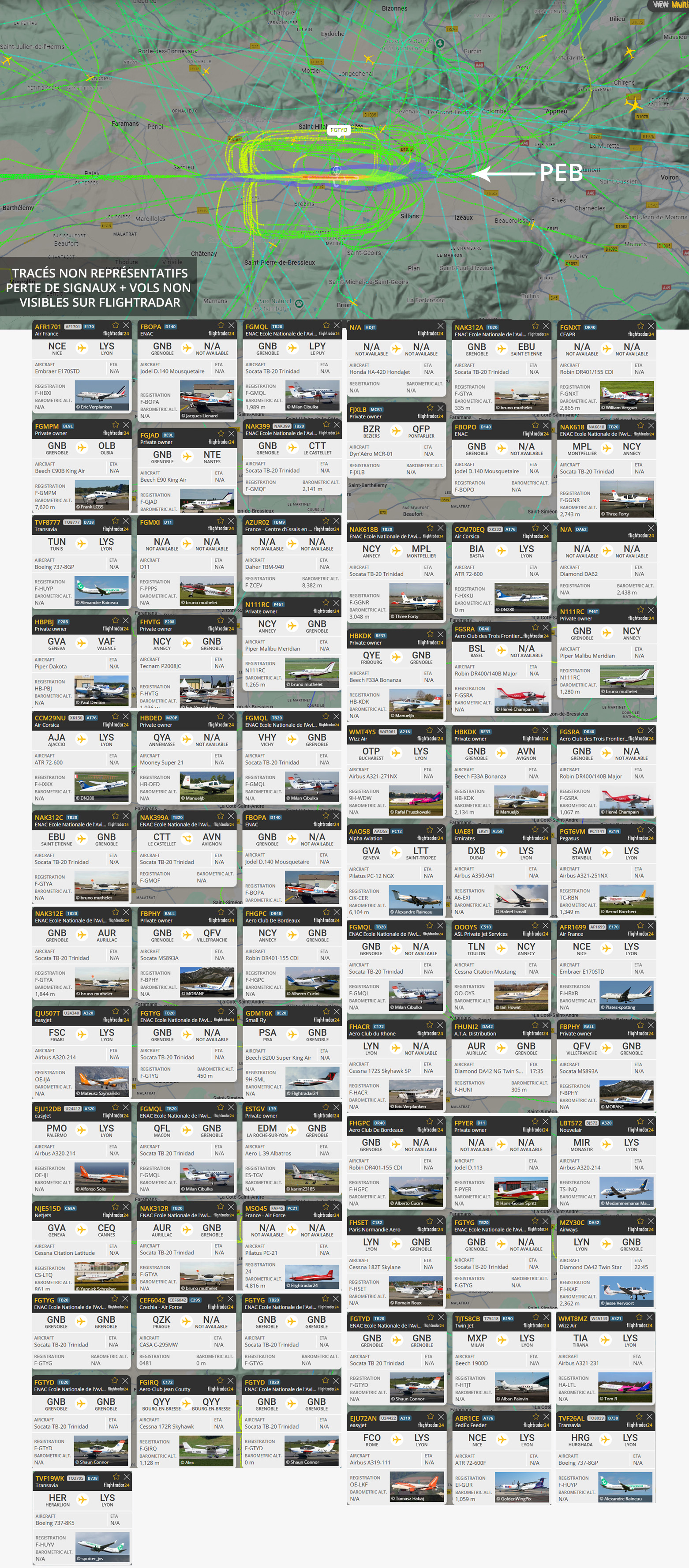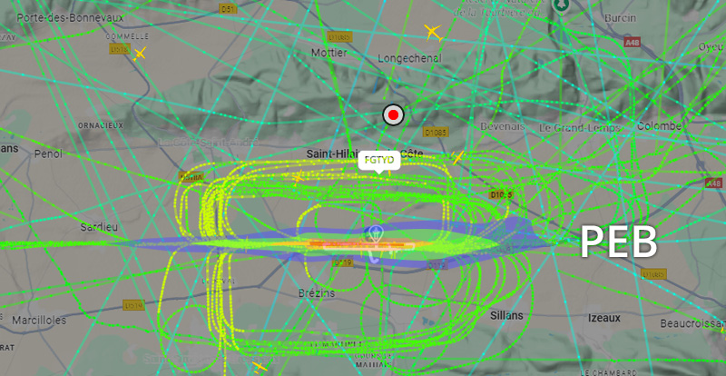 Visuel non représentatif de la réalité, perte fréquente de signaux et vols non visibles sur Flightradar. * PEB : Plan d’exposition au bruit, absolument non représentatif de la réalité.