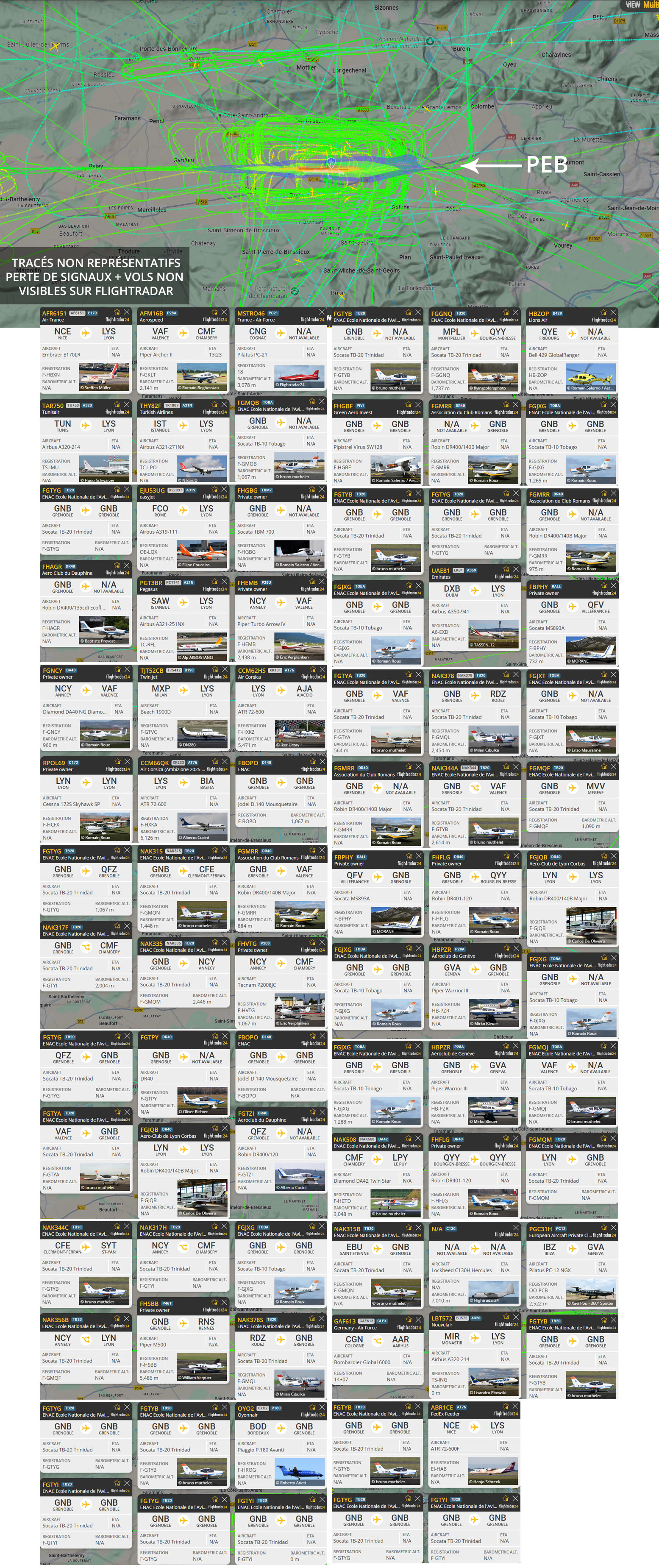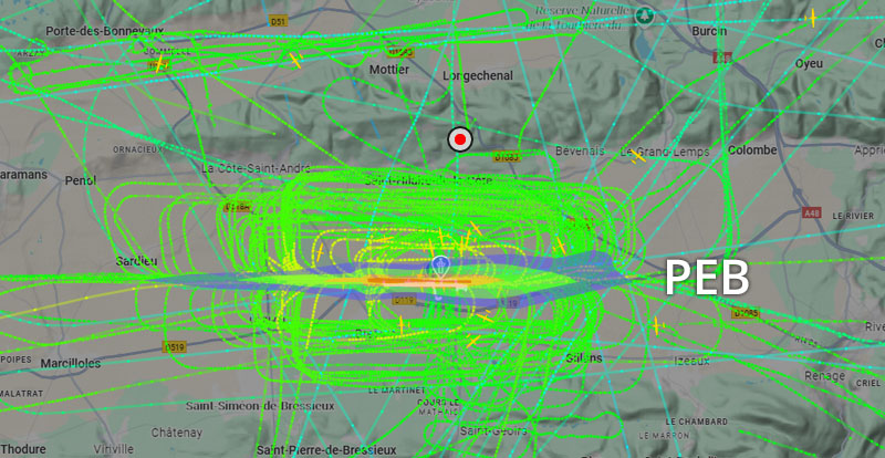 Visuel non représentatif de la réalité, perte fréquente de signaux et vols non visibles sur Flightradar. * PEB : Plan d’exposition au bruit, absolument non représentatif de la réalité.