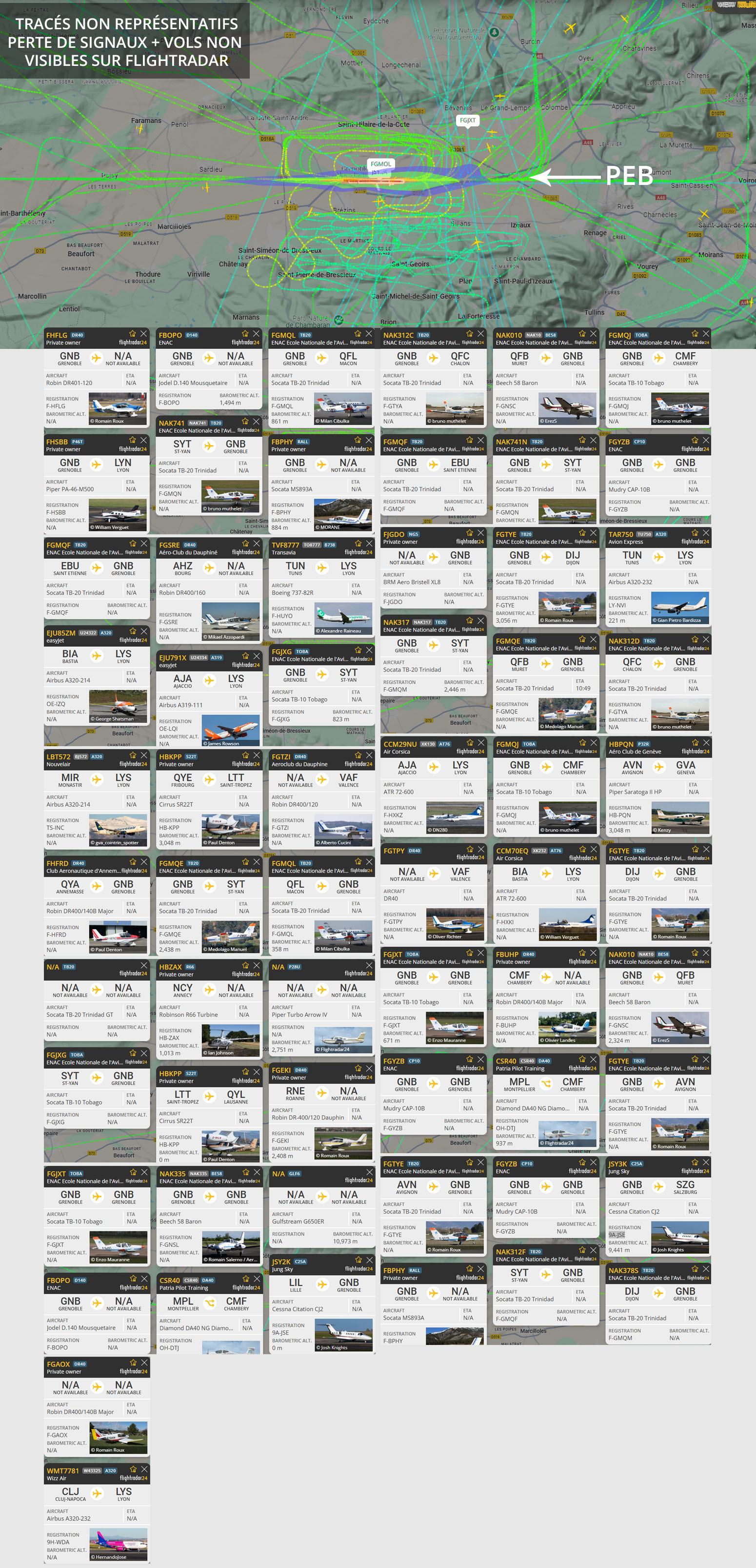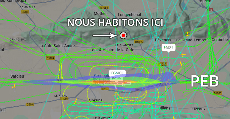 Visuel non représentatif de la réalité, perte fréquente de signaux et vols non visibles sur Flightradar. * PEB : Plan d’exposition au bruit, absolument non représentatif de la réalité.