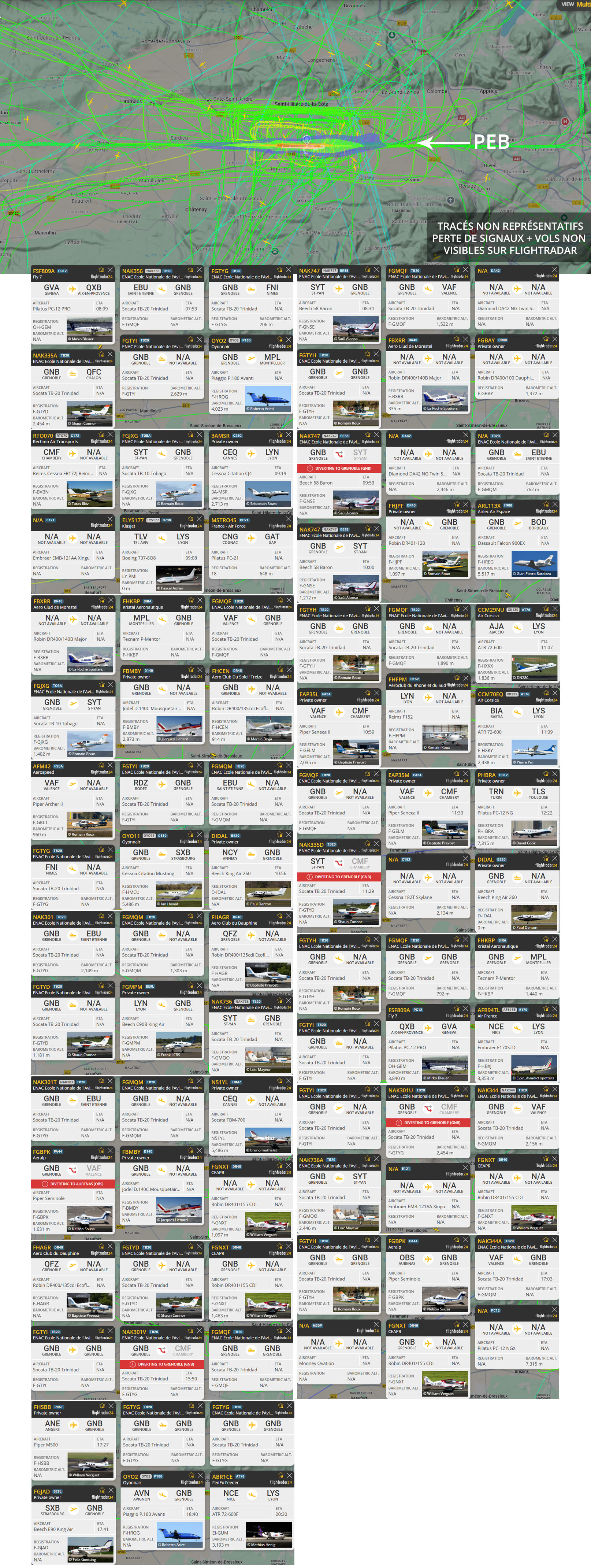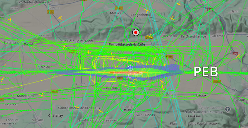 Visuel non représentatif de la réalité, perte fréquente de signaux et vols non visibles sur Flightradar. * PEB : Plan d’exposition au bruit, absolument non représentatif de la réalité.